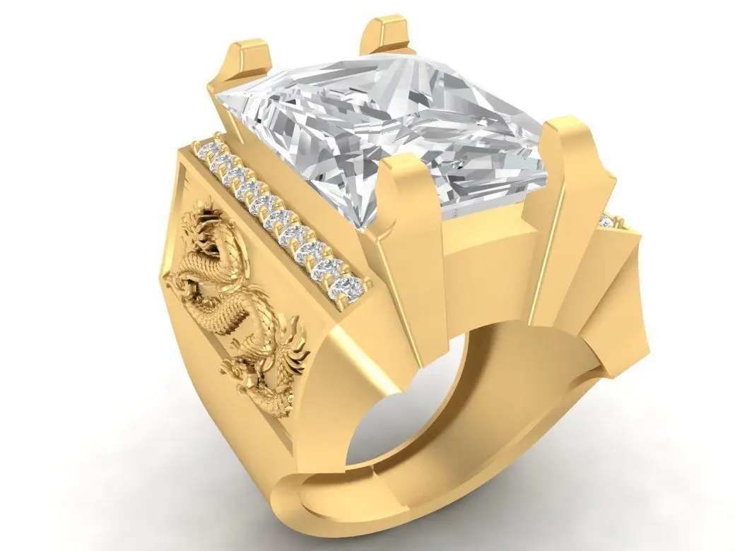 This 3D jewelry model showcases a bold and luxurious men’s statement ring featuring a large square-cut emerald-style center stone. The strong geometric structure, combined with thick prongs and detailed side engravings, creates a powerful design suitable for premium men’s jewelry collections. The substantial band and elevated center setting emphasize durability, while ornamental elements on the shank add depth and refinement.