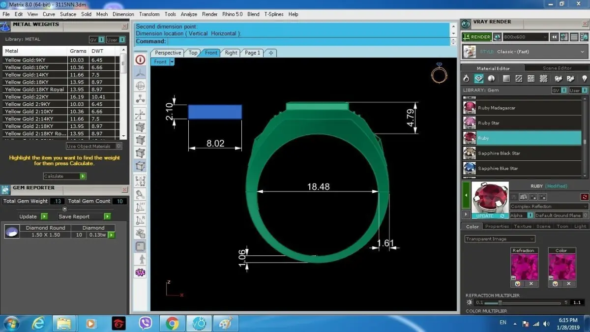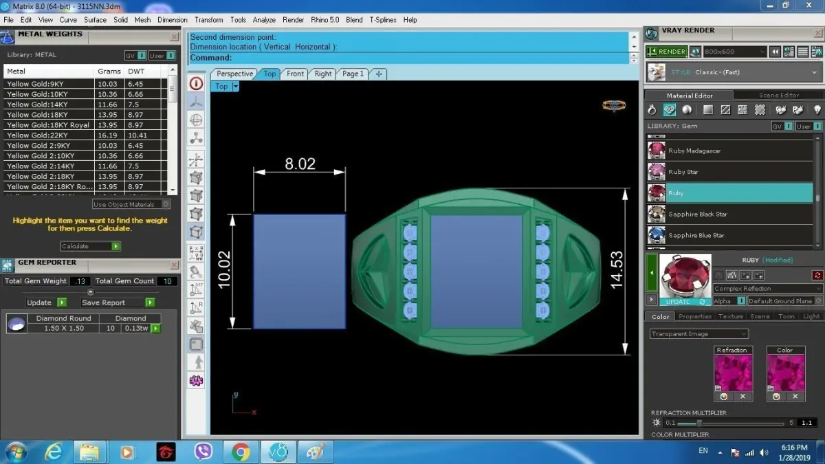 The model is fully optimized for 3D printing, CNC milling, and direct casting. It can be crafted in 14K, 18K, or 22K gold, as well as platinum. The main stone can be set with emerald, ruby, sapphire, or onyx, while the baguette side stones may be diamonds, cubic zirconia, or other gemstones depending on budget.