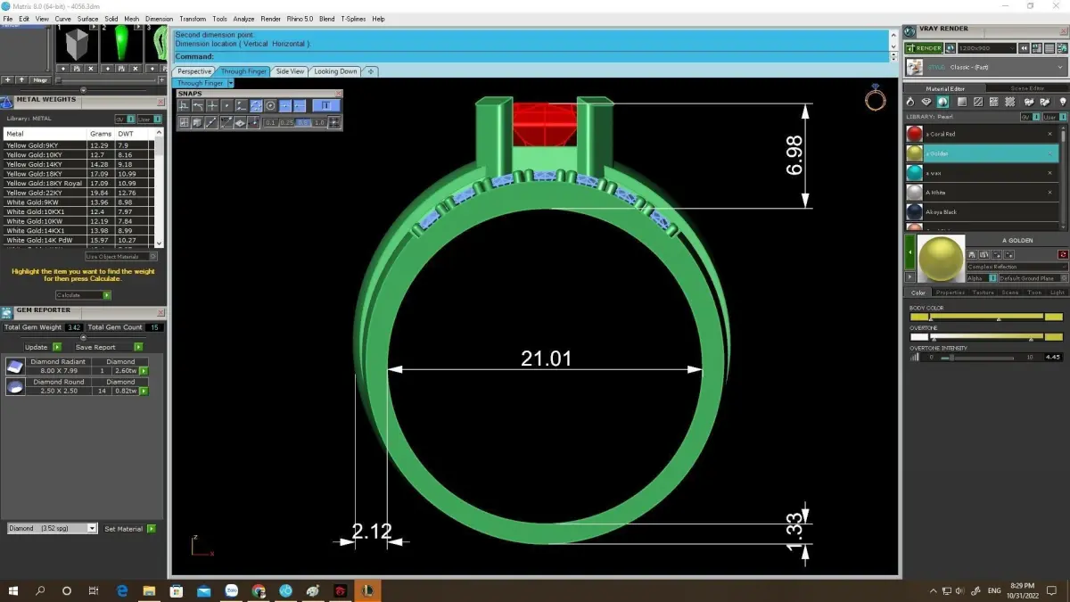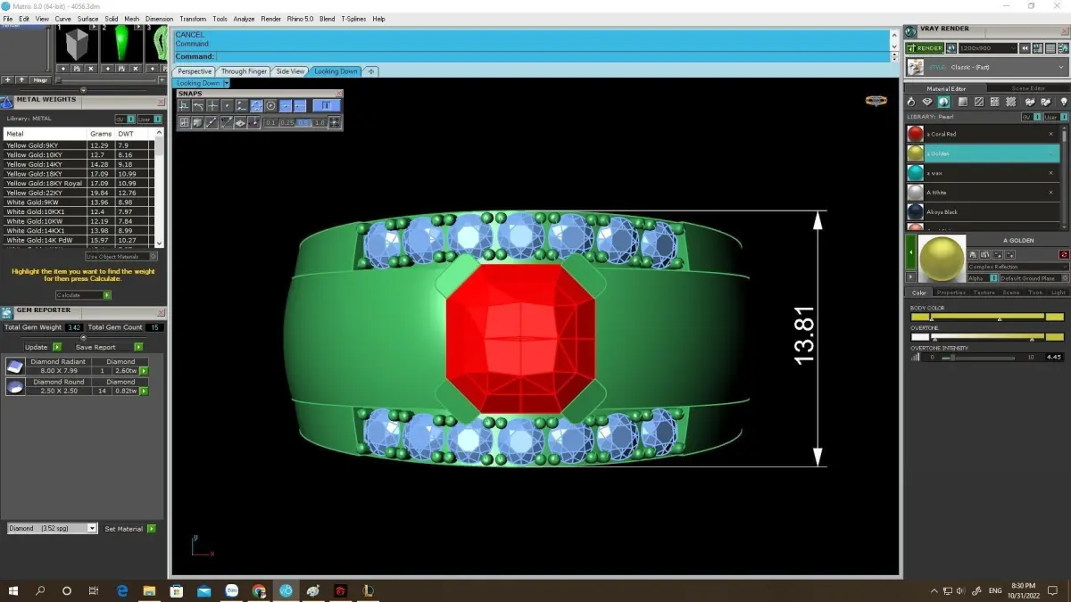 All preview images include full technical information such as exact dimensions, gemstone sizes, stone quantity, and estimated metal weight. The model is carefully prepared for precious metal casting, including gold and silver.