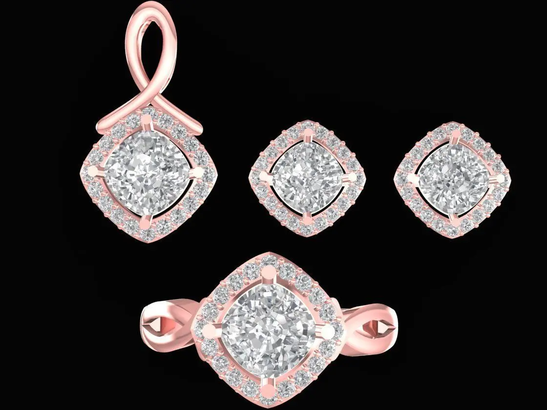 This Luxury Square Halo Diamond Jewelry Set 3D model includes a matching ring, earrings, and pendant designed with precision and elegance. Each piece features a cushion-shaped halo setting surrounding a brilliant-cut center stone, offering timeless sparkle and sophistication.