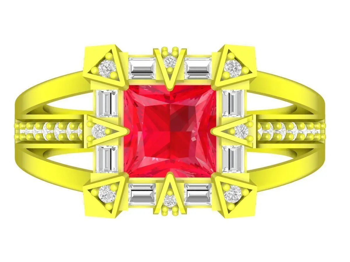 This 3D jewelry model showcases a luxury ring design featuring a square-cut center gemstone secured by a bold architectural setting. The centerpiece is surrounded by a geometric halo structure with accent stones, creating a strong and elegant visual balance.