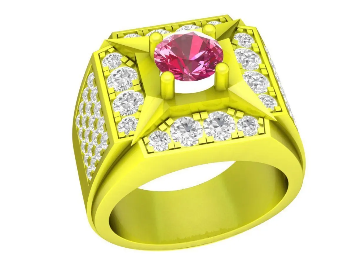 This 3D jewelry model features a luxury square halo gemstone ring designed with a bold and masculine aesthetic. The ring showcases a prominent round center gemstone securely set within a square frame, surrounded by multiple rows of pave-set round stones for enhanced brilliance.