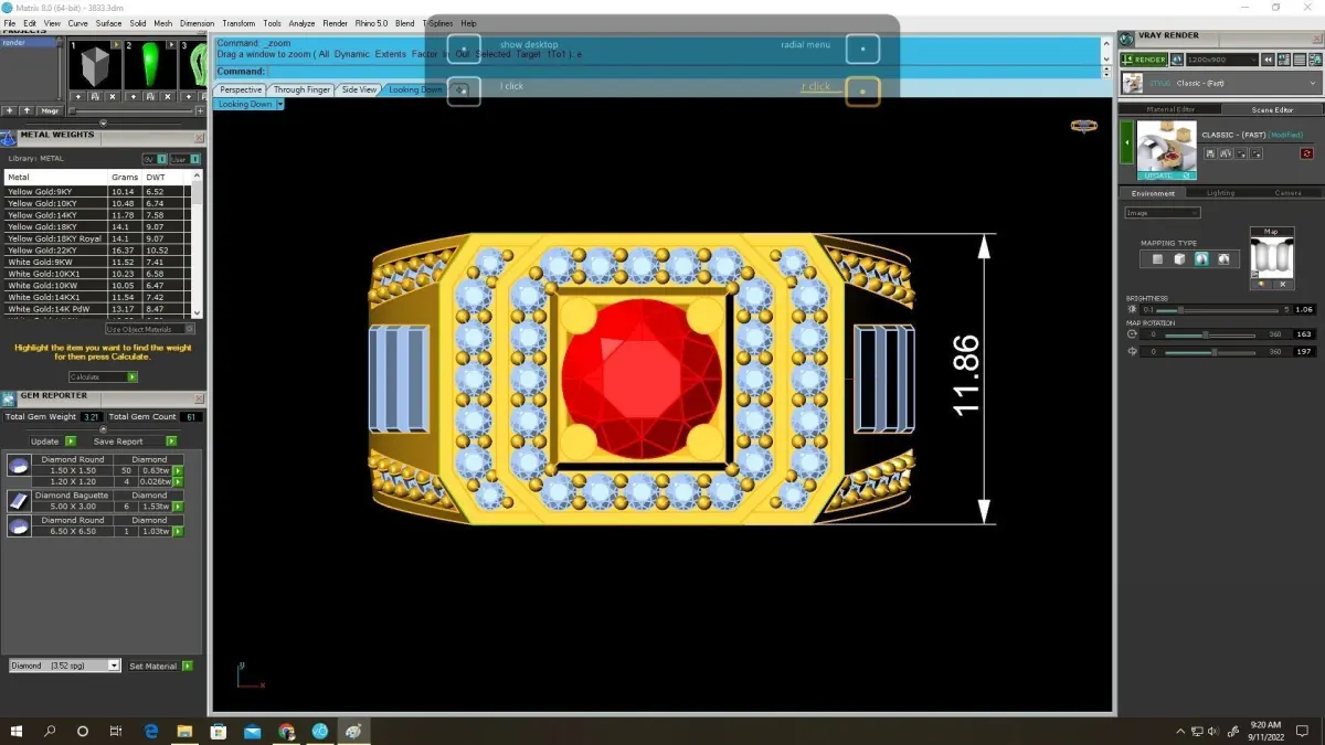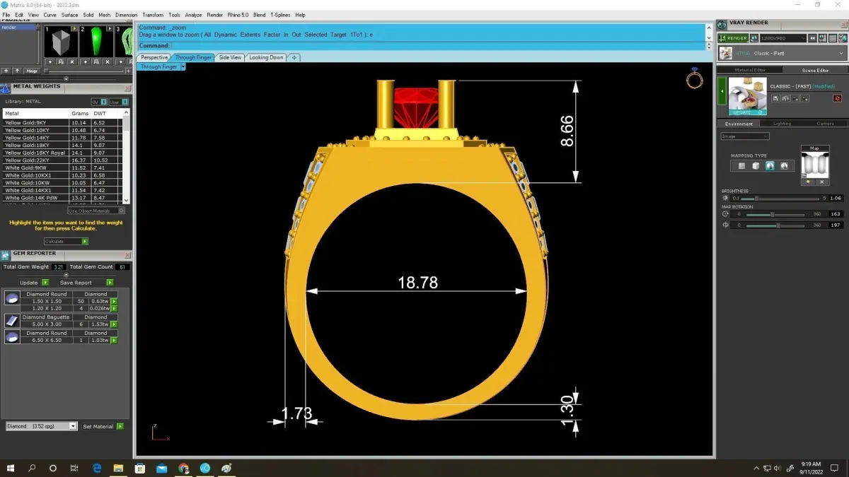Preview renders include detailed measurements, stone dimensions, and metal volume information to guide jewelers through professional fabrication. Suitable for gold, silver, or platinum, this ring can be easily resized or customized. Its bold profile and luxurious gemstone arrangement make it a standout choice for men’s fine jewelry collections.
