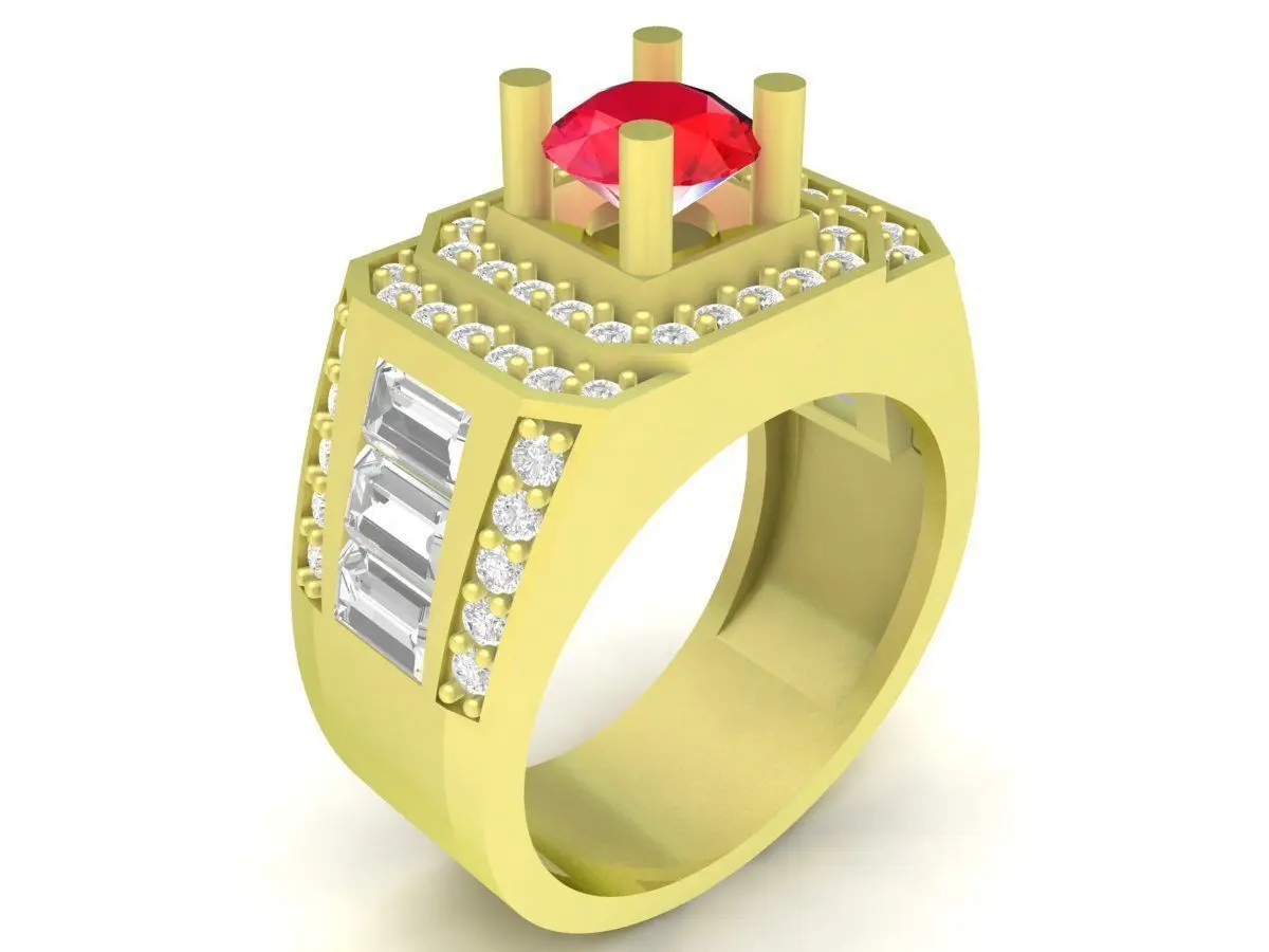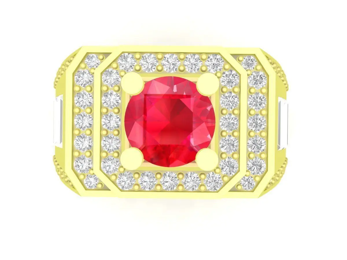 This 3D model showcases a bold square-top men’s ring featuring a vibrant red center gemstone, framed by baguette-cut stones on both sides and surrounded by pavé-set diamonds. The strong geometric structure and layered setting create a powerful, masculine look that is ideal for premium fashion jewelry and luxury custom orders. The stepped design enhances depth and highlights the central stone from multiple angles.