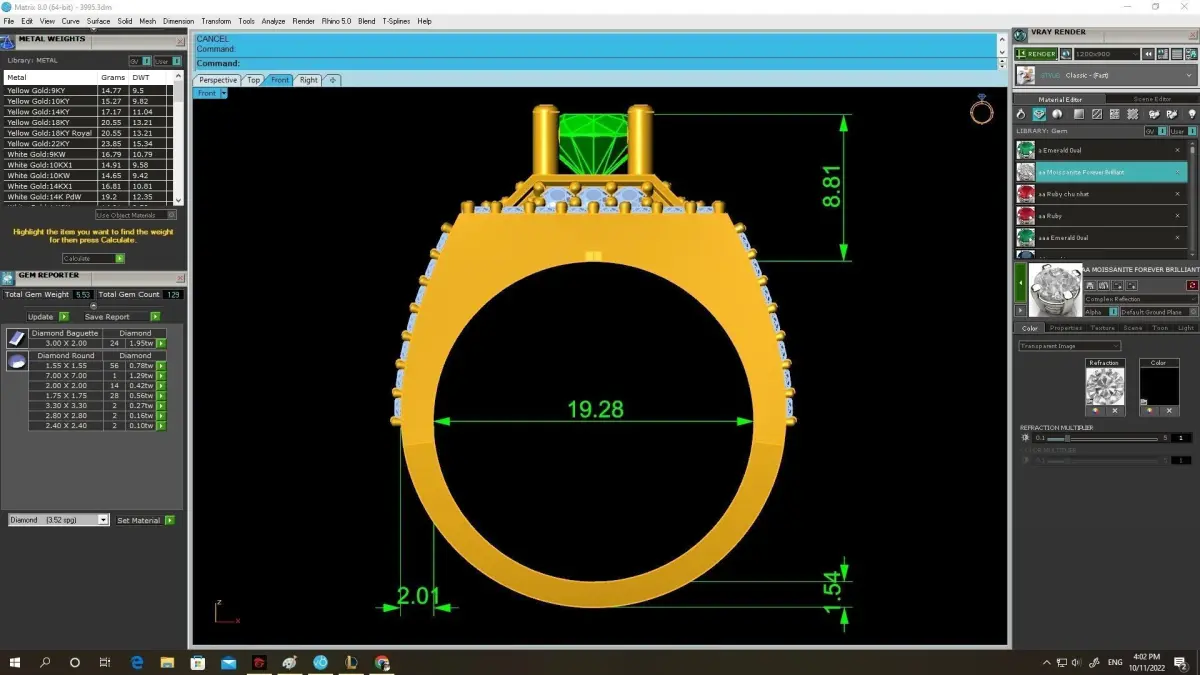 All essential technical specifications, including exact dimensions, gemstone sizes, stone counts, and estimated metal weight, are clearly displayed in the preview images. This allows jewelers and manufacturers to accurately evaluate the design before casting.