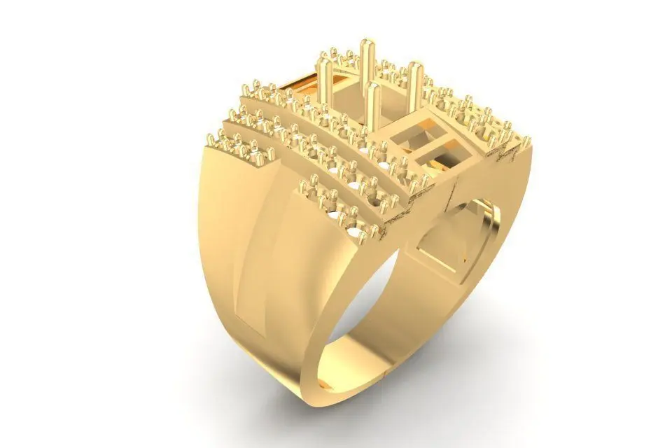 This 3D model showcases a luxury men's ring design featuring a bold square top with multiple stone settings. The model reflects a modern architectural aesthetic with clean lines and strong geometric symmetry, making it ideal for high-end jewelry collections.