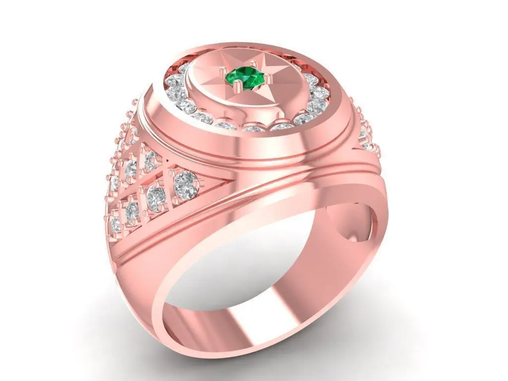 This luxury men’s ring features a bold circular face with a star compass design at the center, symbolizing direction, power, and protection. The middle gemstone adds a vibrant touch of color, surrounded by a halo of brilliant diamonds that create a striking contrast and highlight the geometric structure. With its detailed craftsmanship and elegant proportions, this ring exudes masculine sophistication and prestige.