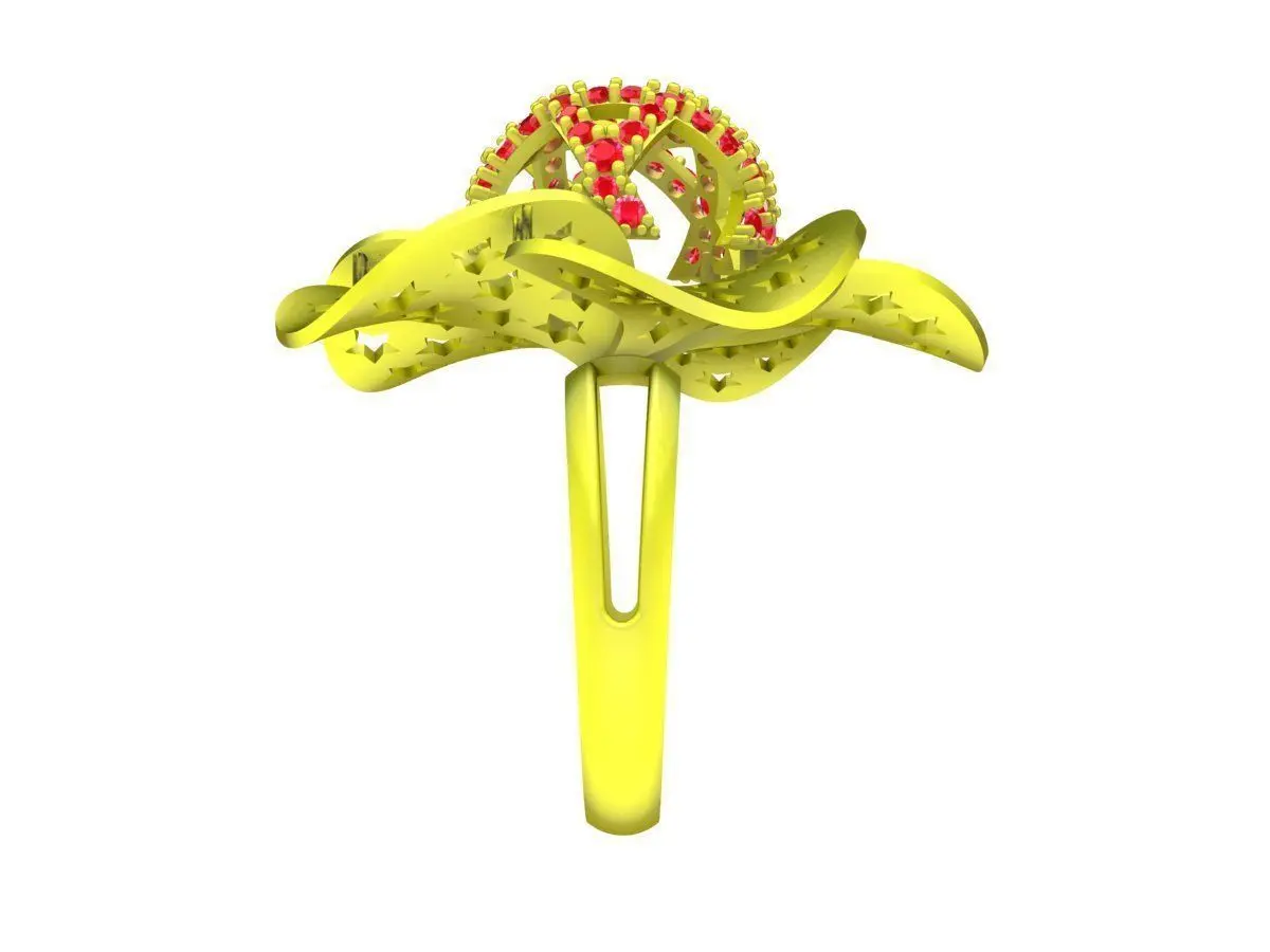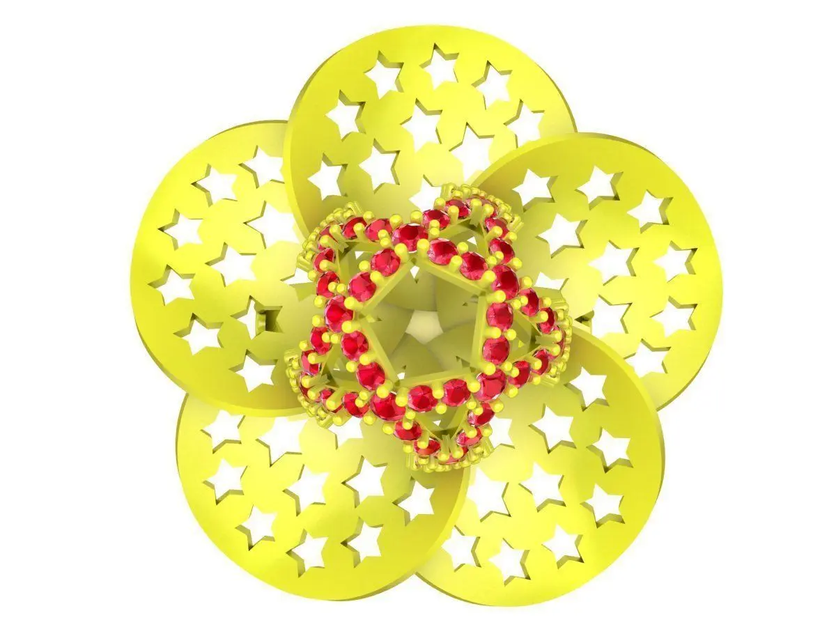 This luxury ring 3D model features a distinctive floral design composed of multiple rounded petals with star-shaped openwork detailing. At the center, a raised pavé gemstone cluster creates a striking focal point, adding brilliance and depth to the overall composition. The combination of open metalwork and gemstone accents delivers a bold yet elegant aesthetic.