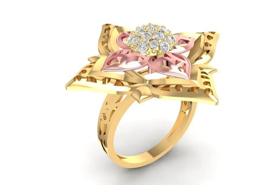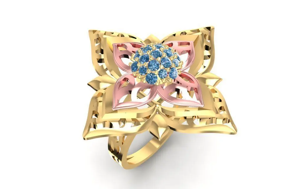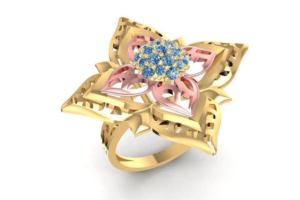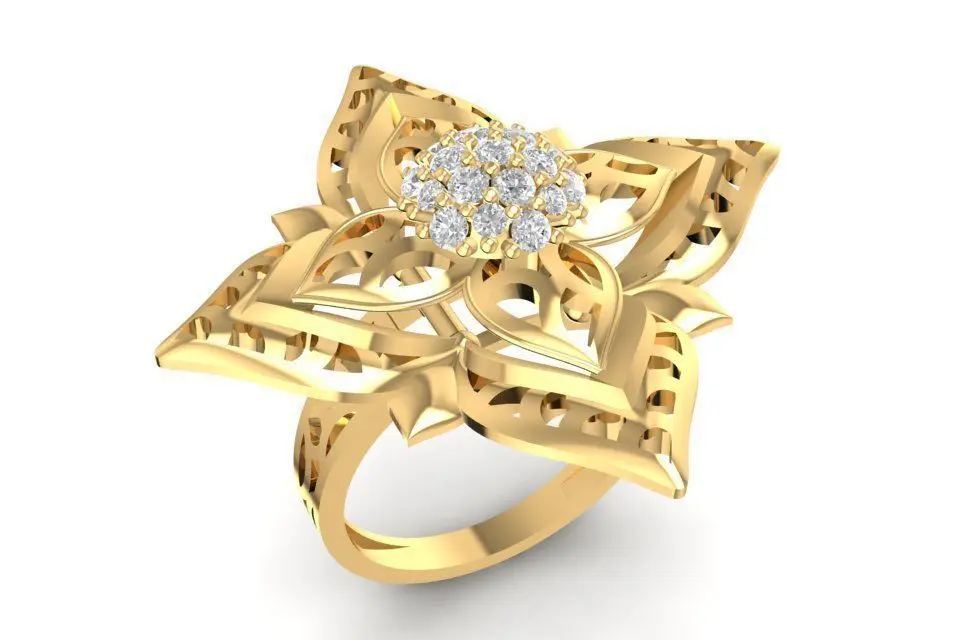 This luxury star flower diamond ring for women 3D model features a multi-layered floral structure with a radiant central gemstone surrounded by brilliant-cut pavé diamonds.