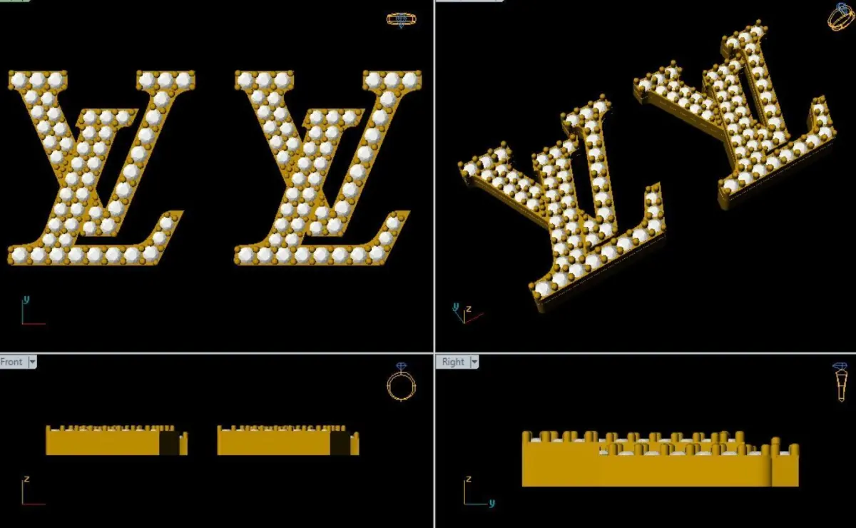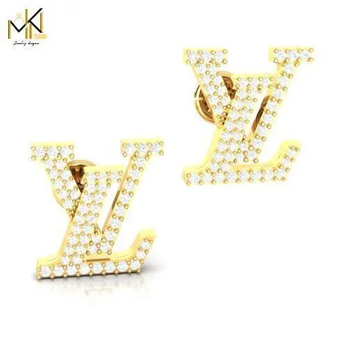 This is a high-quality 3D model of a pair of luxury-style gold earrings featuring a monogram-style geometric letterform design embellished with brilliant-cut diamond-style stones. Perfect for use in jewelry visualizations, fashion renders, AR/VR assets, animations, and 3D printing prototypes.