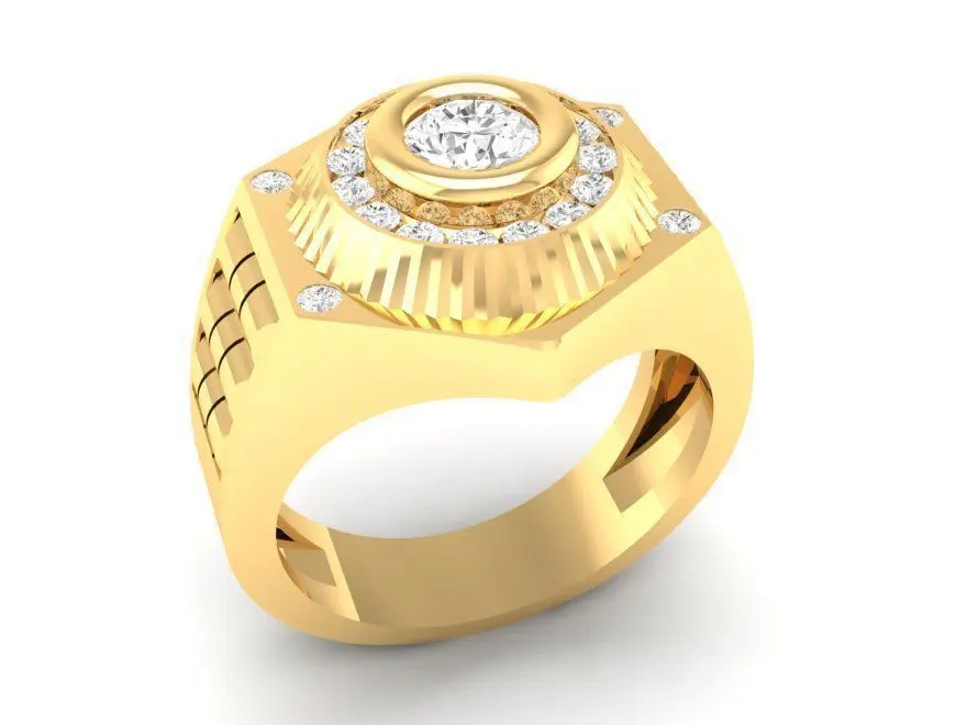 This 3D model showcases a luxury sunburst round diamond ring for men, designed with a bold circular face surrounded by radiant grooved lines resembling sunlight rays. The center holds a brilliant round gemstone enhanced by smaller accent stones on both sides, symbolizing power and refinement. The sturdy band provides a strong masculine appearance while maintaining balance and comfort.