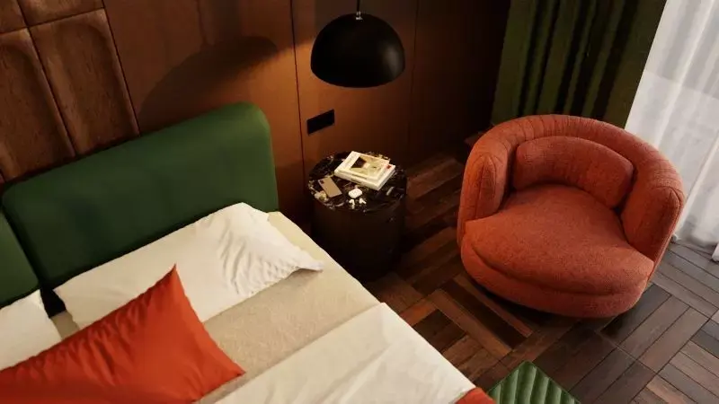 - Full bedroom scene with bed, nightstands, armchair, rug, curtains, and lighting setup