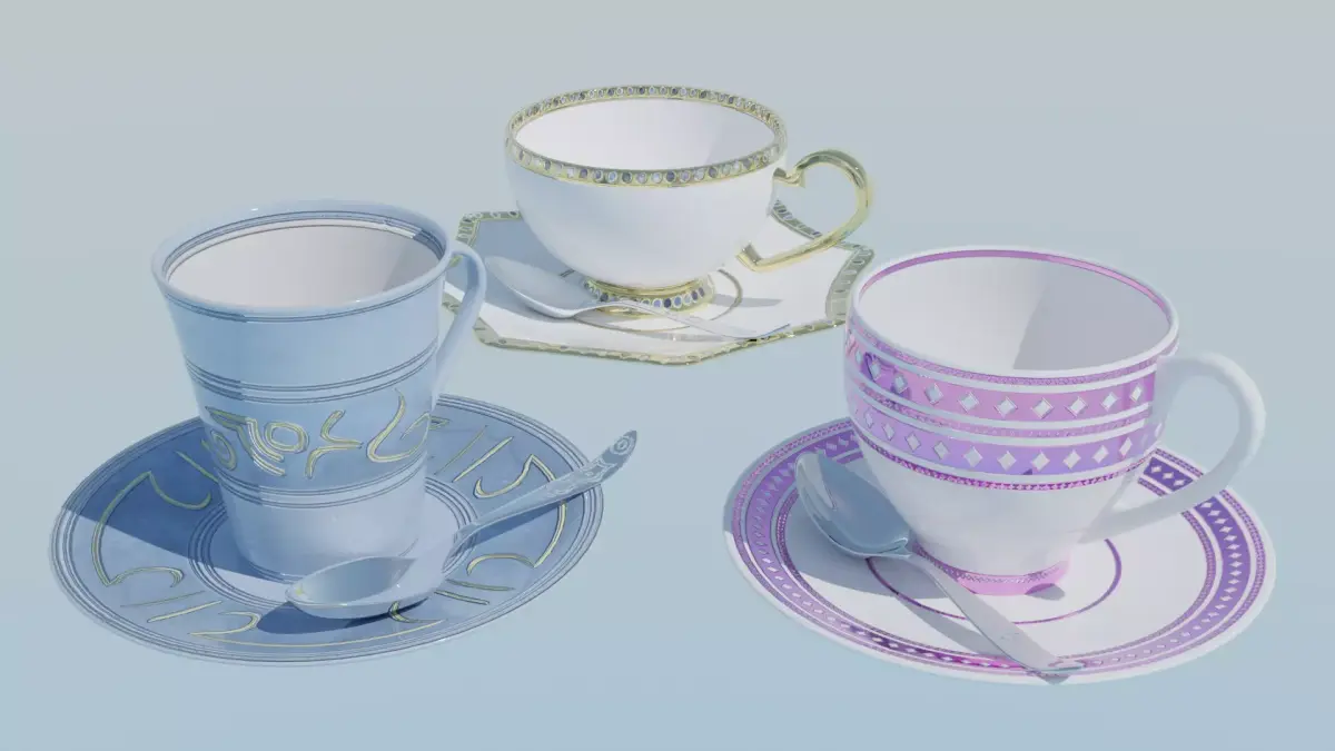 A premium 3D tea cup collection featuring three unique and beautifully detailed designs:
