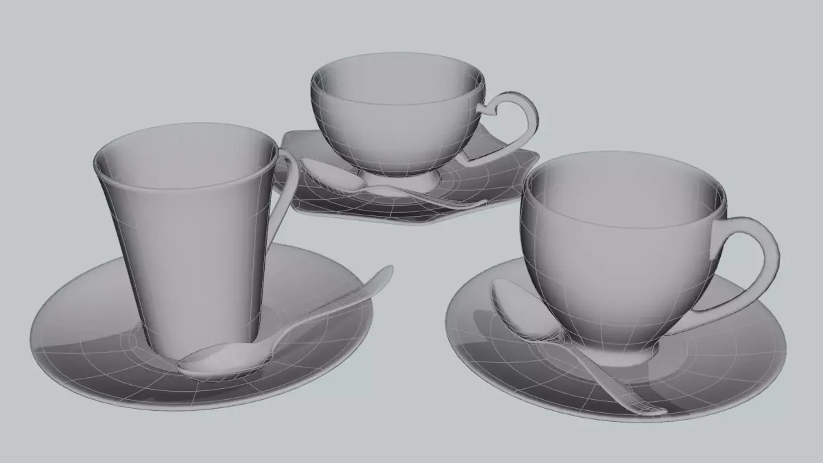 Each set includes a cup, saucer, and spoon, all carefully modeled to scale and finished with high-quality PBR textures. Perfect for kitchen visualizations, product showcases, or café concepts.
