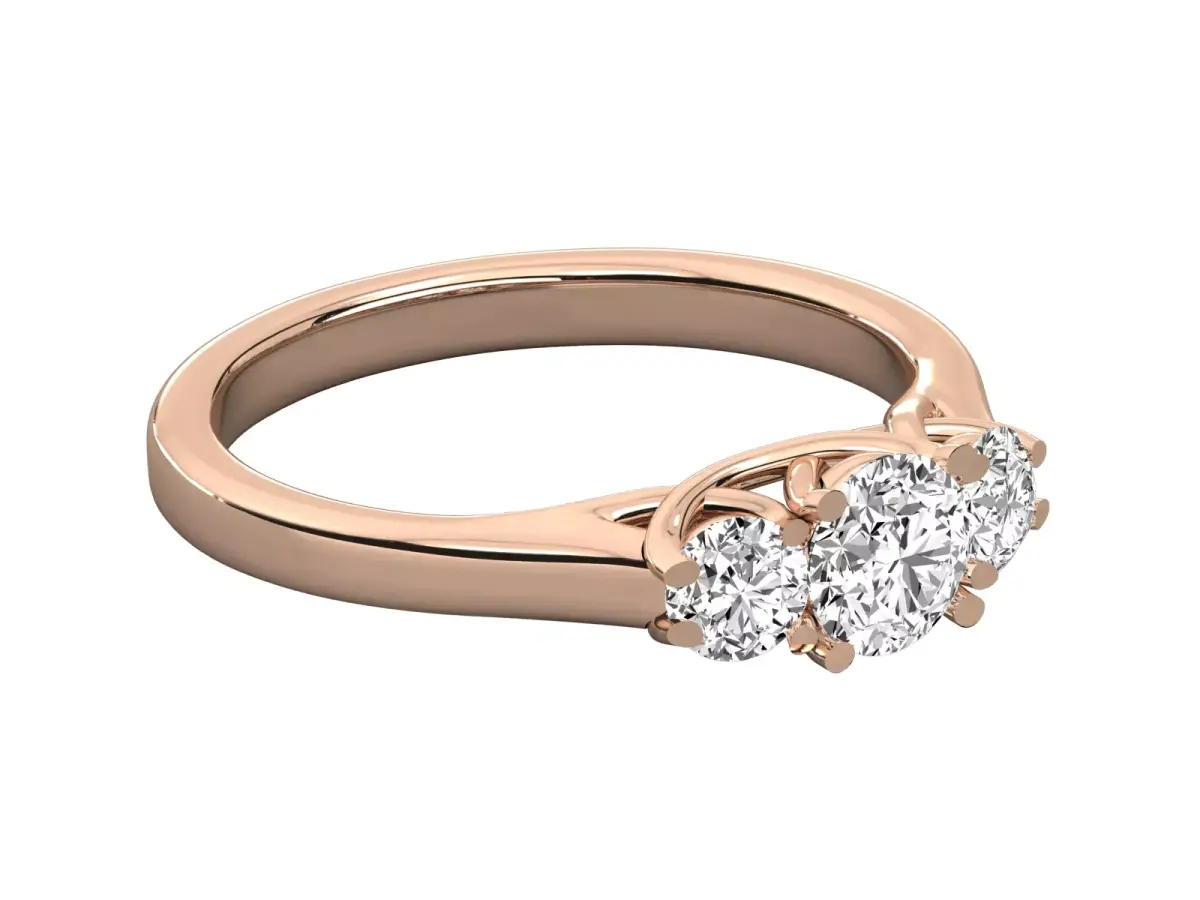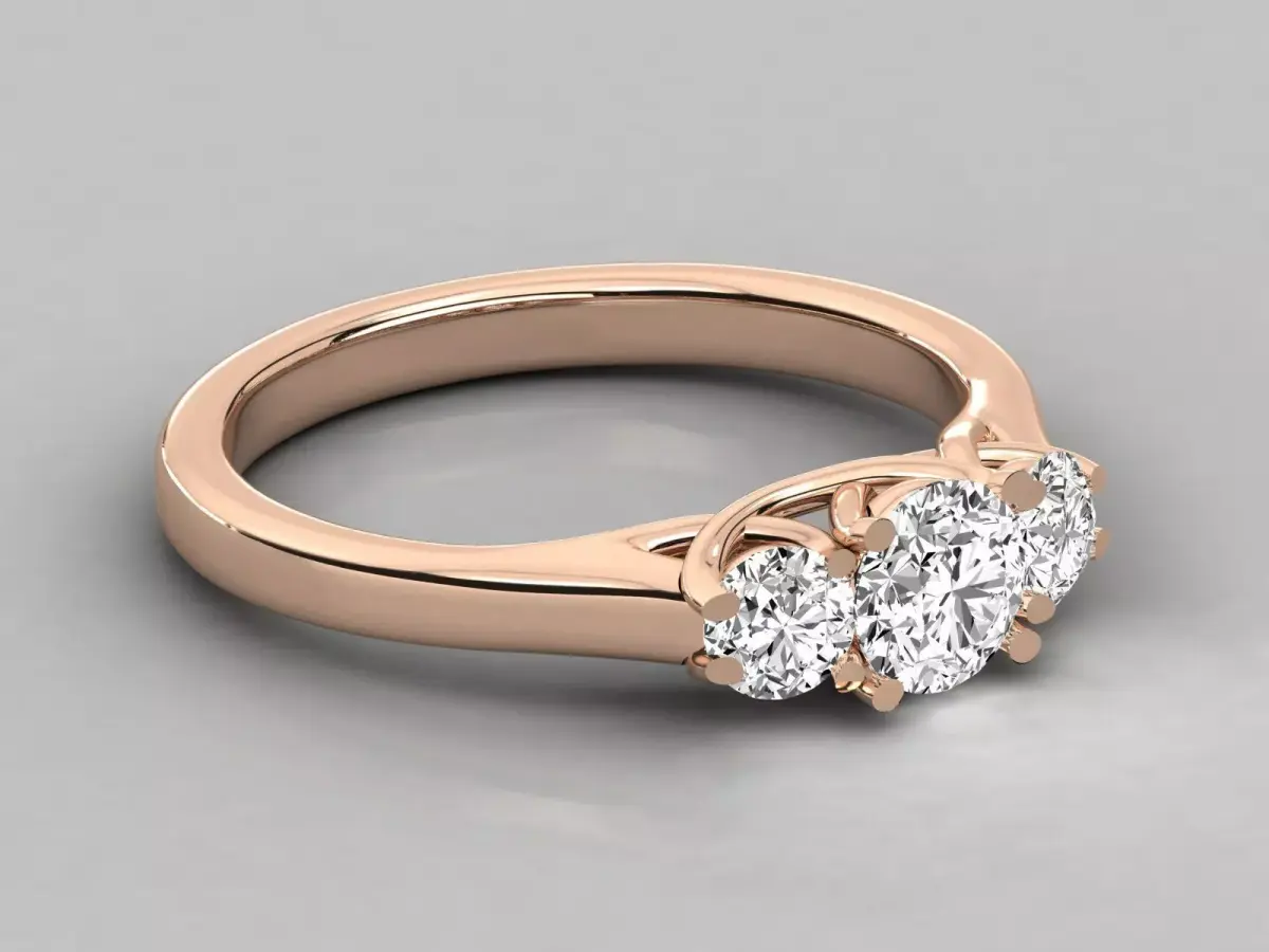 This jewellery CAD ring design features a three stone arrangement with a round center diamond and two matching side diamonds. The band is smooth, durable, and ergonomically designed for comfort. The model is optimized for casting, polishing, and precise stone setting.