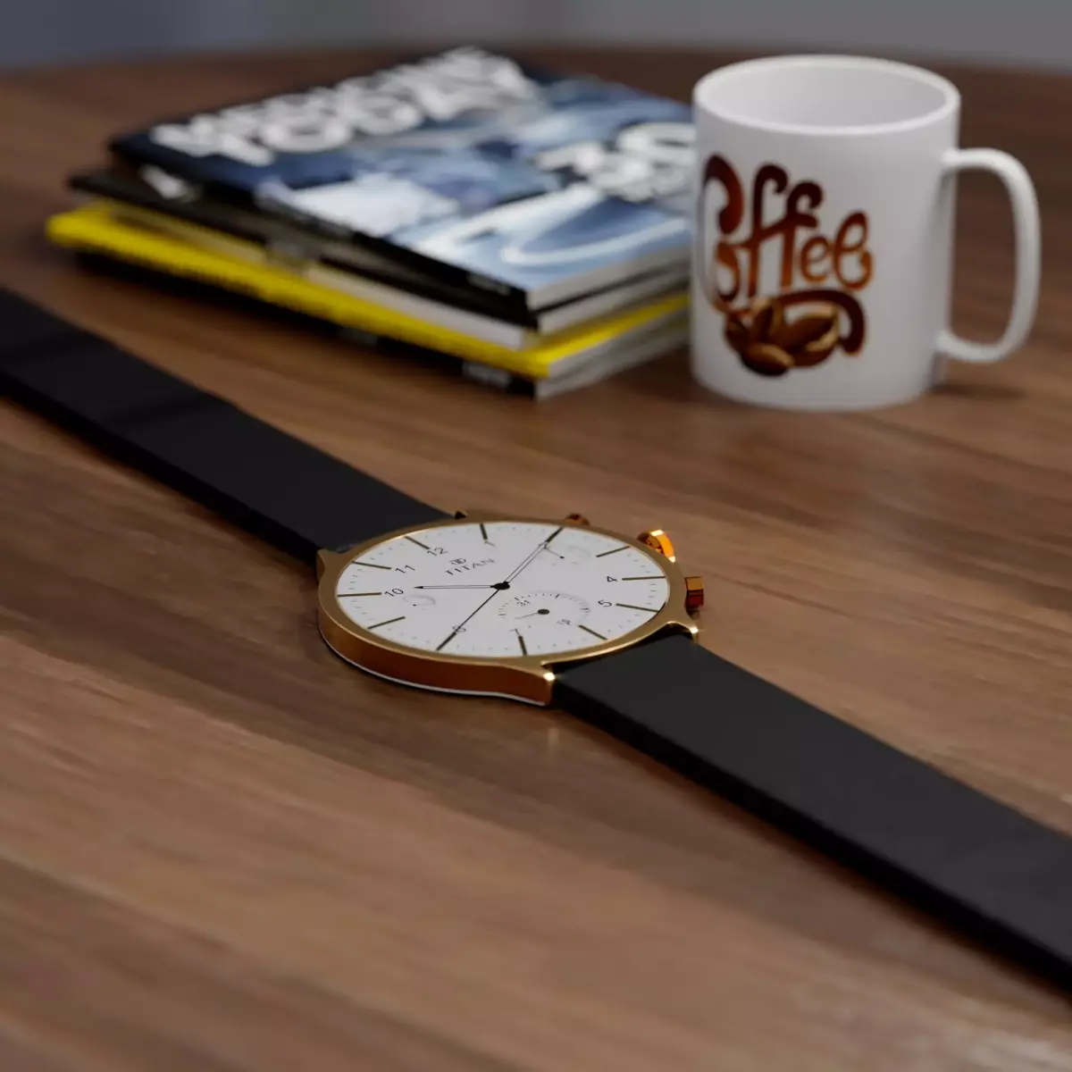 A high-quality Titan wristwatch 3D model designed with attention to fine details and realistic materials.This model features a gold metal body, textured leather strap, and polished glass surface, perfect for use in product animation, advertising, motion graphics, or close-up renders.