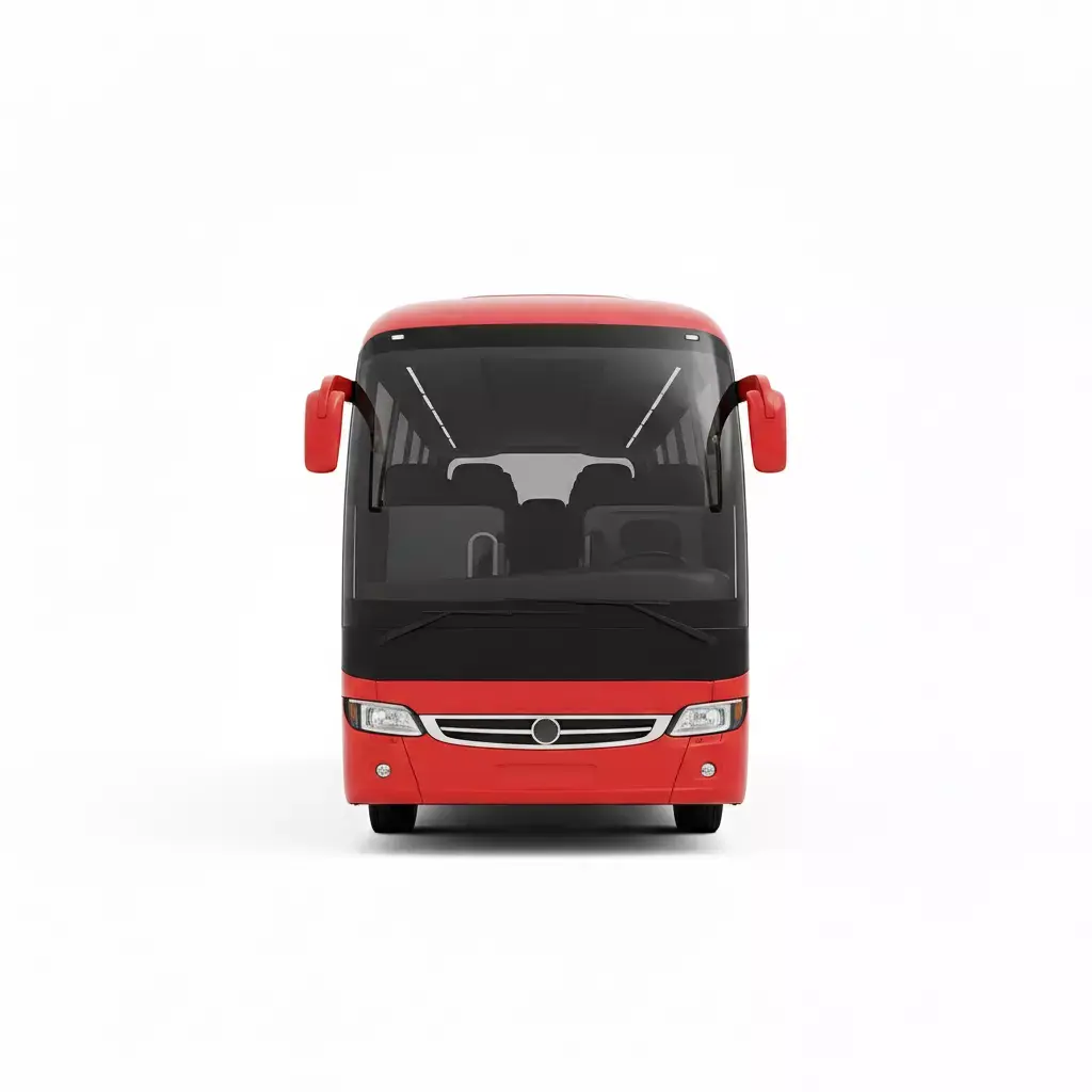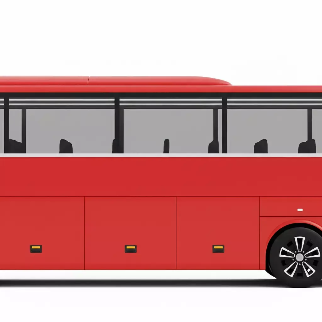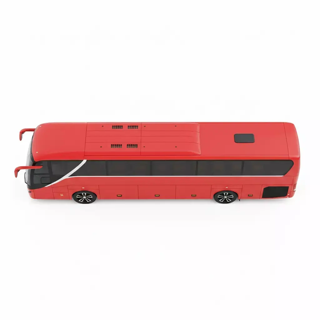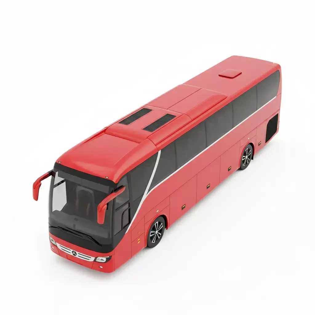 This is a contemporary 3D render of a luxury touring coach bus or motor coach, designed for long-distance passenger travel. The vehicle features a streamlined, aerodynamic body finished in a bold, glossy red color. It boasts large panoramic windows, a raised passenger cabin for storage underneath, and modern styling cues including aggressive headlights and a sleek front grille (with an emblem suggesting a Mercedes-Benz model). The model is rendered from a low, front-three-quarter perspective against a clean white background, emphasizing its size and modern design. This 3D asset is ideal for visualizations, simulations, or game environments focused on public or commercial transportation.