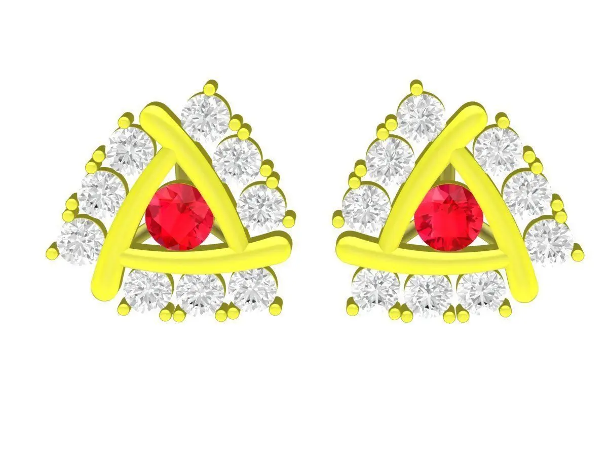 This luxury stud earrings 3D model features a modern triangular design centered around a vivid ruby gemstone, framed by a refined halo of round-cut diamonds. The clean geometric form combined with sparkling accents creates a contemporary yet elegant look, suitable for high-end women’s jewelry collections.