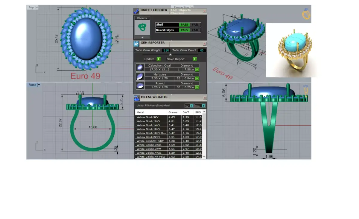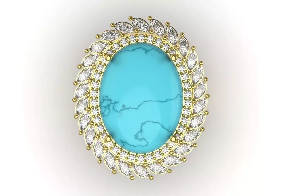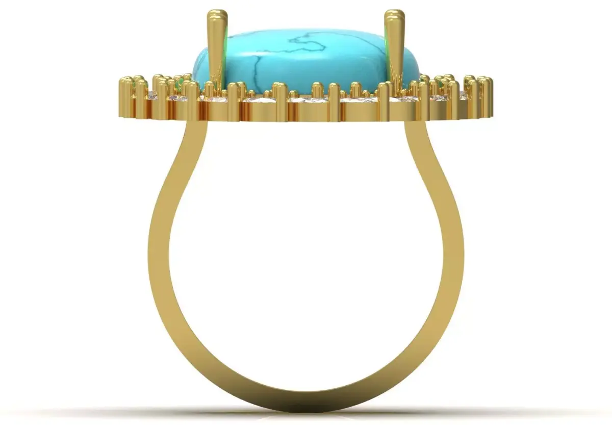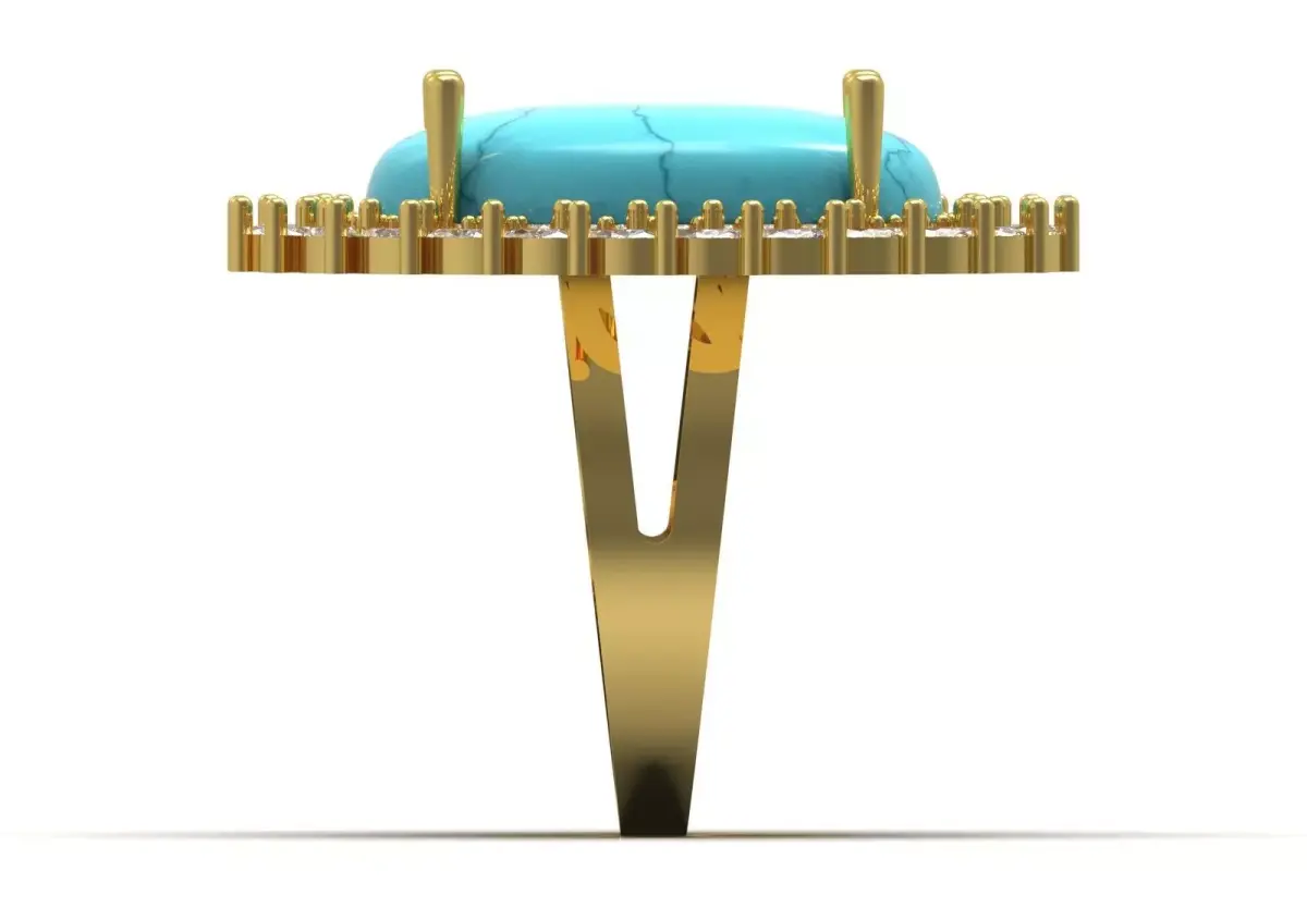 - Large Gemstone: In the center of the ring, a large cabochon-cut gemstone in turquoise or light blue is placed.
