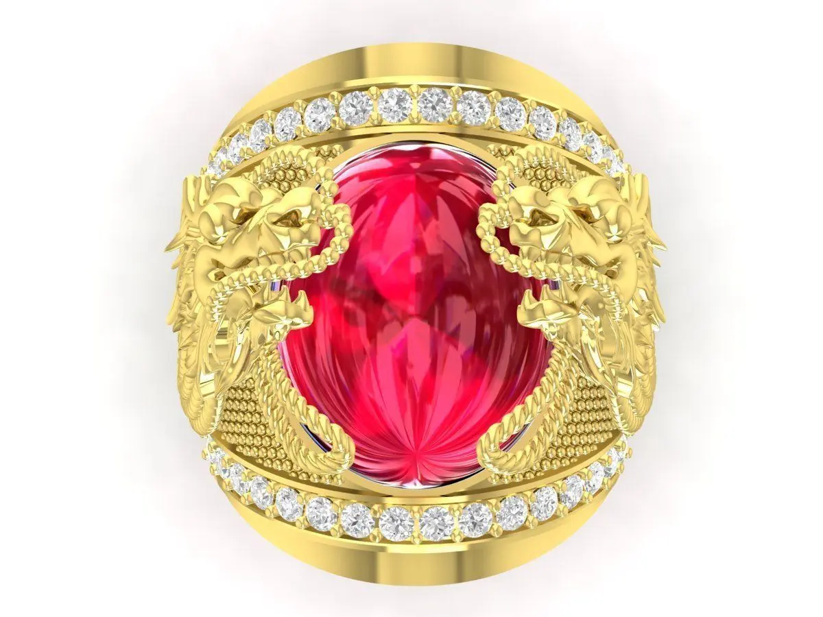 This luxury twin dragon red gem ring is a striking 3D jewelry model designed for men who appreciate powerful, symbolic, and high-end accessories. The centerpiece features a large red gemstone embraced by two detailed dragons, representing strength, wealth, and protection in Asian culture. Each dragon is carefully sculpted with sharp scales, flowing curves, and lifelike posture, creating a visually intense and premium appearance.