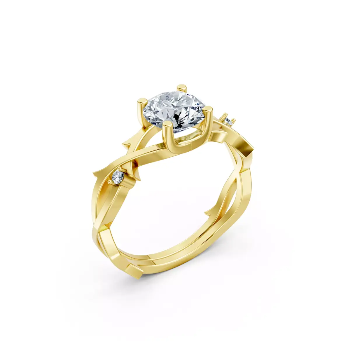 This premium solitaire diamond ring CAD model showcases a bold and modern twisted band design, crafted to deliver a unique balance of elegance and strength. The design features a brilliant round center stone secured in a refined prong setting, complemented by subtle accent diamonds placed along the flowing, sculpted band structure.
