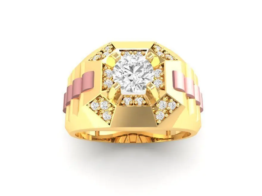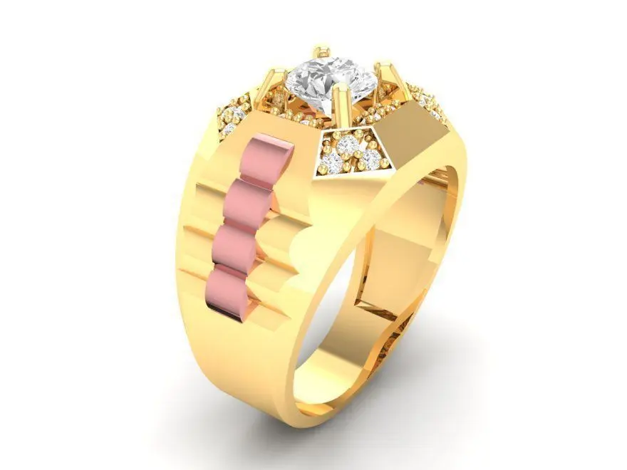 The Luxury Two Tone Diamond Men Ring is a bold and modern CAD jewelry model designed for high-end masculine styling. This ring features a strong geometric structure with a prominent center diamond supported by multiple accent stones, creating an impressive visual balance between brilliance and form. The two-tone combination of yellow gold and rose gold adds depth, luxury, and a distinctive character that appeals to premium men’s fashion and statement jewelry collections.