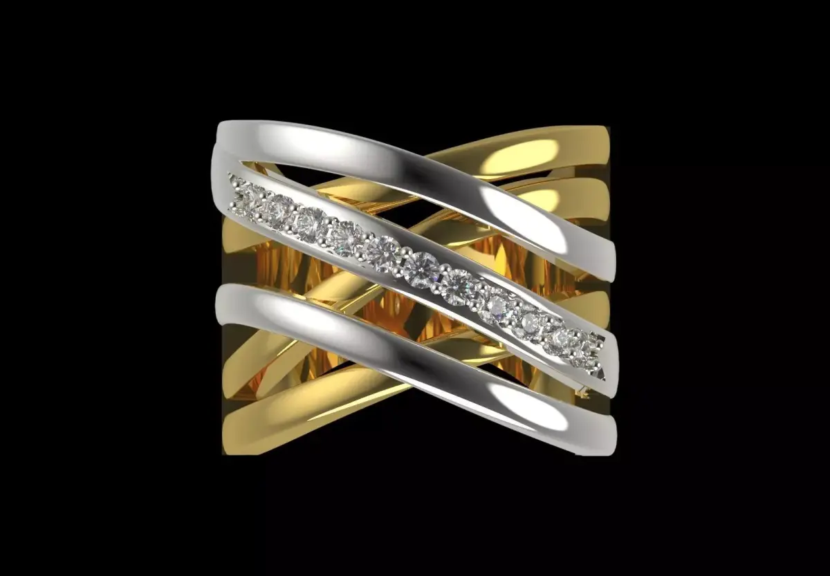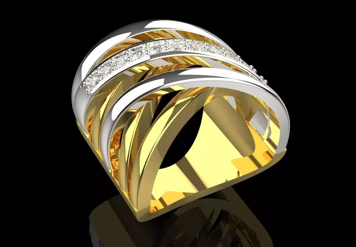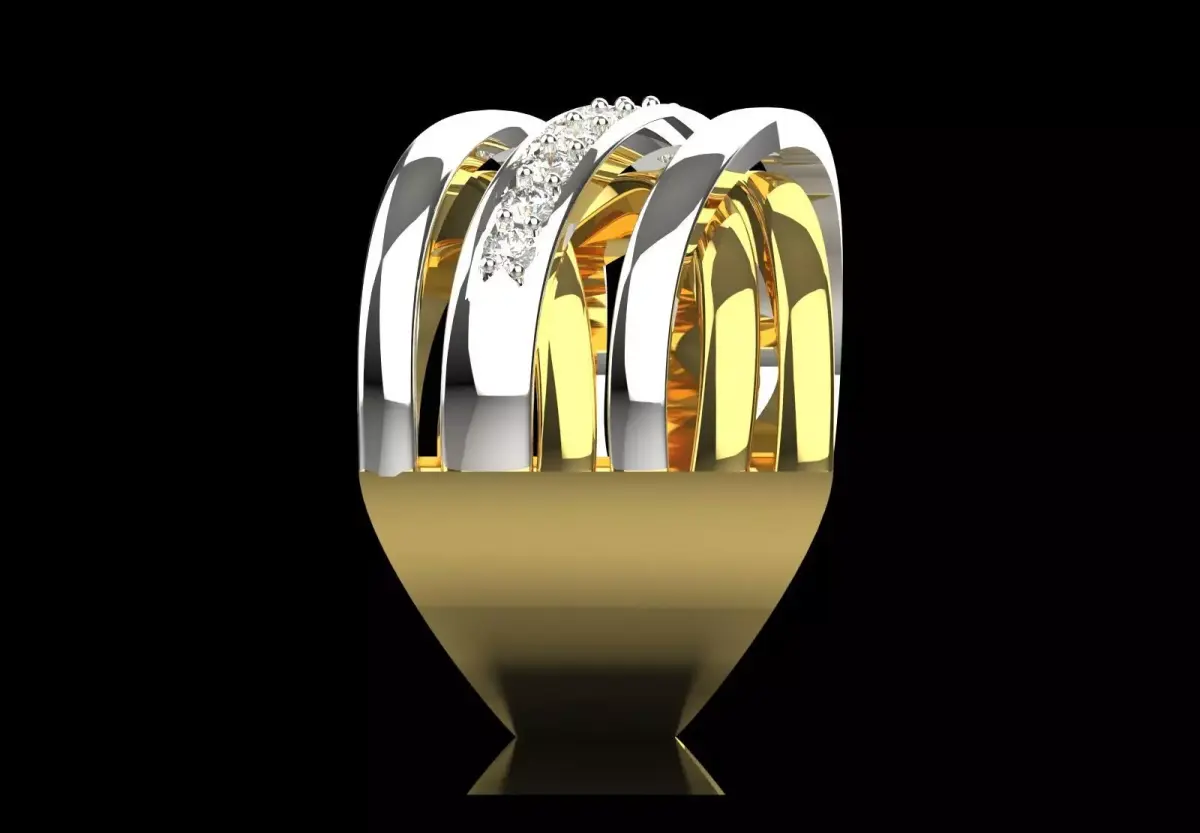 Technically, this ring is made of a combination of yellow gold and white gold. Its design includes numerous bands that are wavy and intertwined, creating a beautiful shape. Parts of these bands are decorated with small and sparkling diamonds that create an eye-catching shine in contrast to the polished surface of the gold. The combination of warm yellow gold and cool white gold, along with sparkling diamonds, has made this ring an impressive and unique piece.