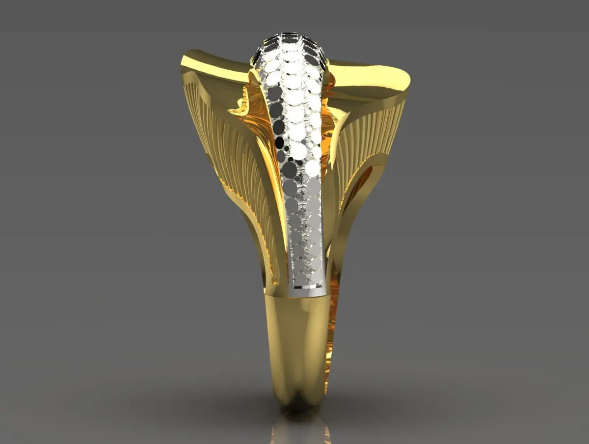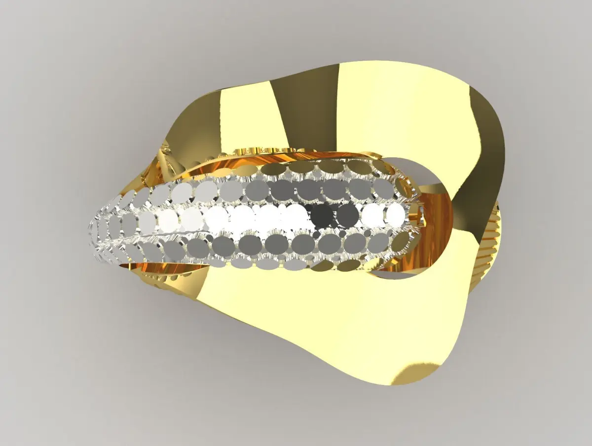 This ring has a unique and modern design, with yellow gold and silver sections placed side by side. The inner part of the ring is simple and shiny, while its surface contains several details; one section contains vertical perforated lines that convey a sense of movement and dynamism, and the other has small black circles placed between sparkling white stones, giving the design a lively and attractive look. This ring is a combination of simplicity and charm, and can be a symbol of modern art and new design in jewelry.