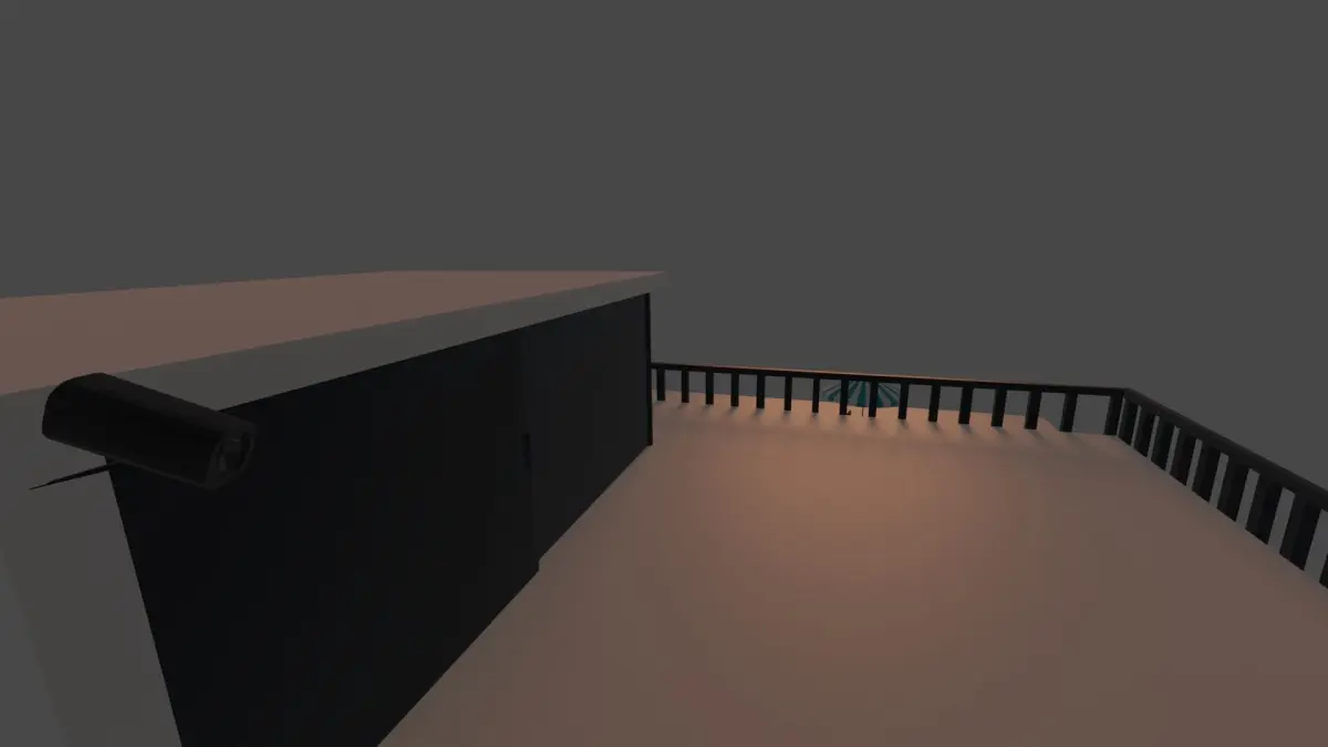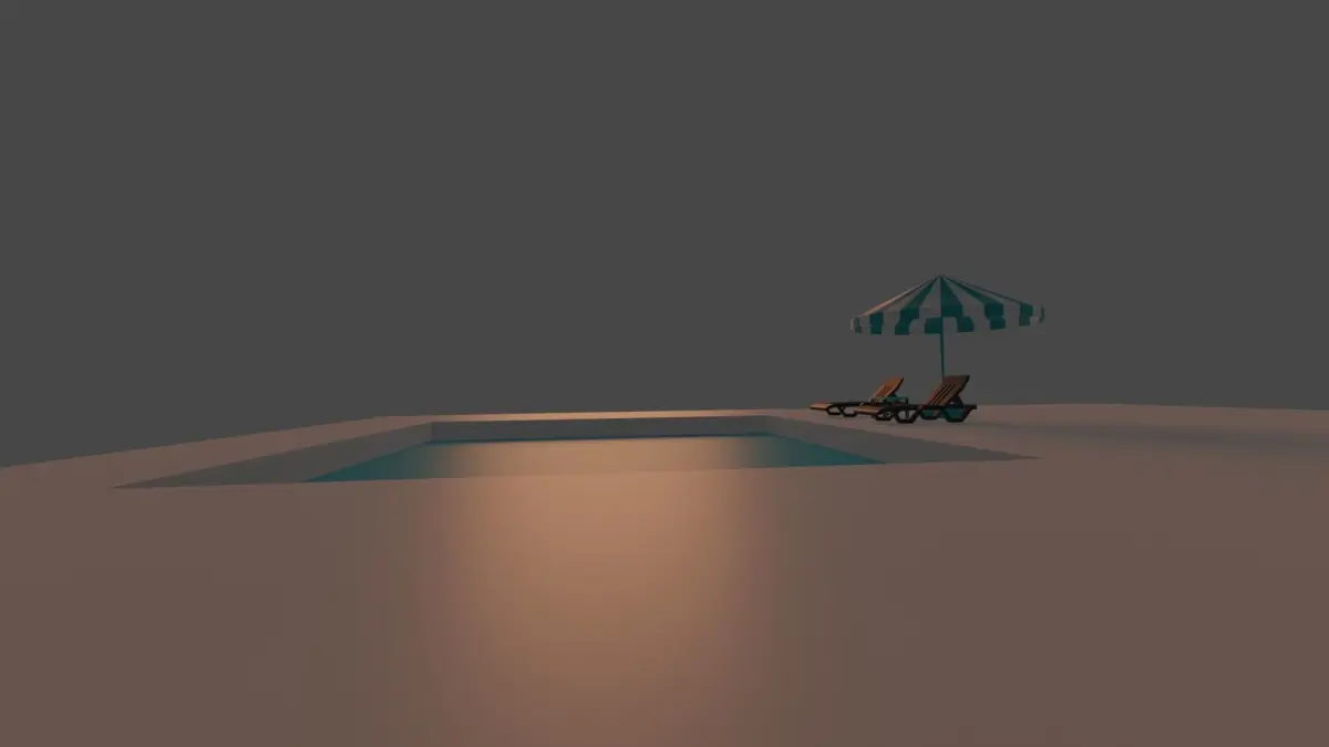 2 bedside tables, 2 table lamps, bookcase and books, 2 lounge chairs, sun umbrella