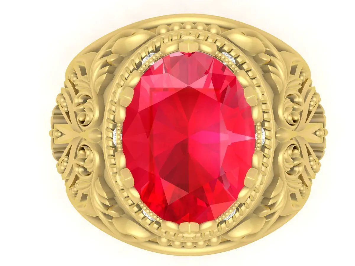 This premium 3D jewelry model features a luxury men’s ring designed with a large oval red gemstone as the centerpiece. The ring showcases an elegant vintage style, combining classical ornamental engravings with a solid and well-balanced structure.