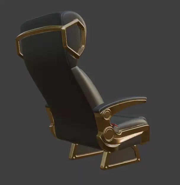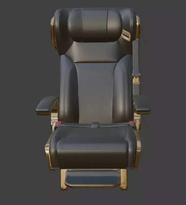 Highly detailed premium luxury VIP aircraft seat 3D model with rich black quilted leather upholstery and polished gold metal accents. Perfect for private jet interiors first-class airplane cabins luxury yacht scenes high-end visualizations and cinematic renders. Clean topology non-overlapping UVs PBR materials ready for V-Ray Corona Arnold Redshift Octane and all major render engines.