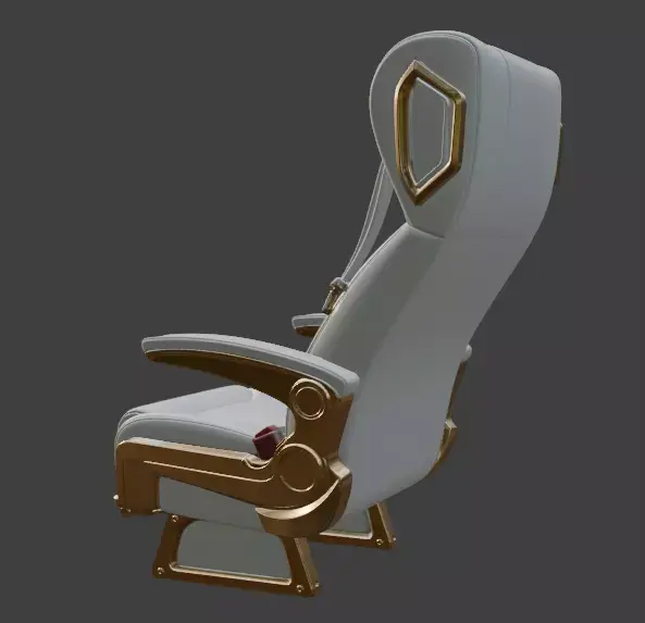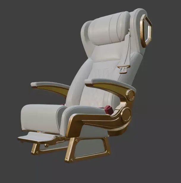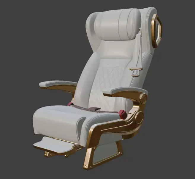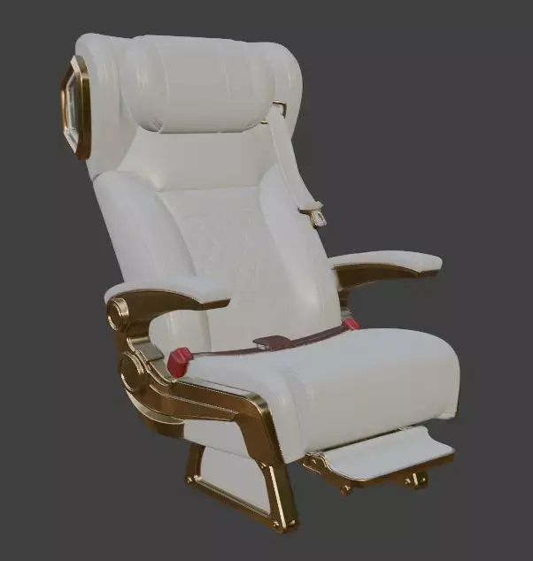 Highly detailed premium luxury VIP aircraft seat 3D model with rich white quilted leather upholstery and polished gold metal accents. Perfect for private jet interiors first-class airplane cabins luxury yacht scenes high-end visualizations and cinematic renders. Clean topology non-overlapping UVs PBR materials ready for V-Ray Corona Arnold Redshift Octane and all major render engines.