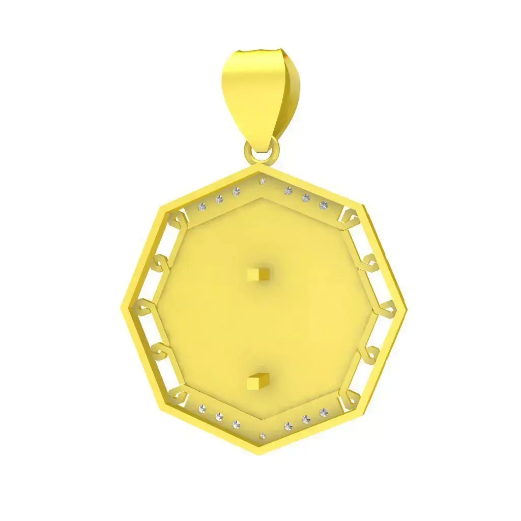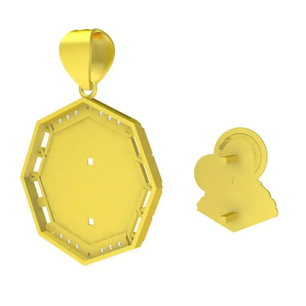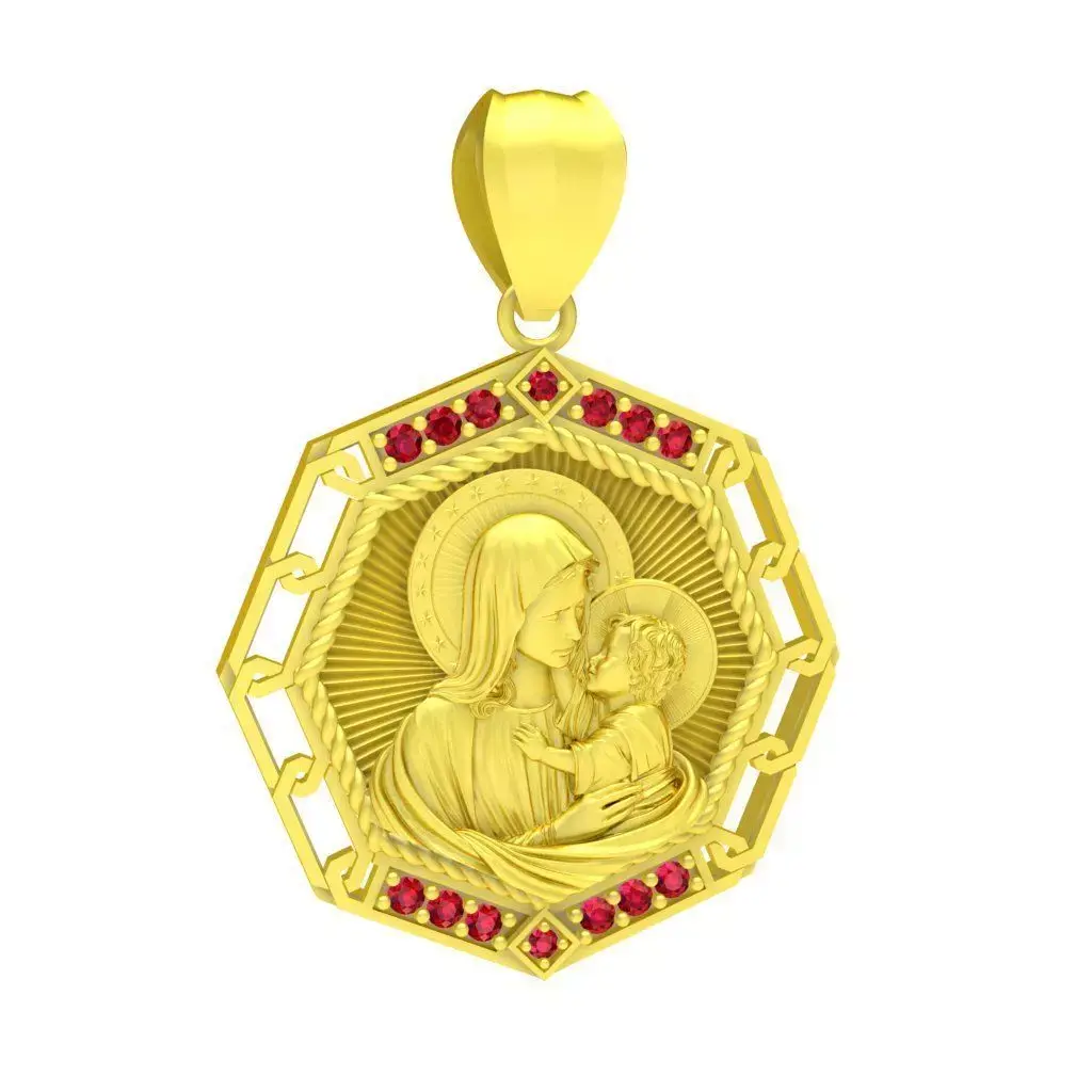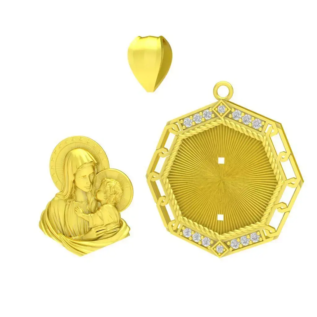 This luxury Virgin Mary and Child religious pendant 3D model is a refined and meaningful jewelry design created for professional fine jewelry production. The pendant features a detailed relief of the Virgin Mary holding the Holy Child, surrounded by a radiant halo background that symbolizes love, protection, and faith. The sacred scene is framed within an elegant octagonal structure, enhanced by decorative rope details and pavé gemstone accents.
