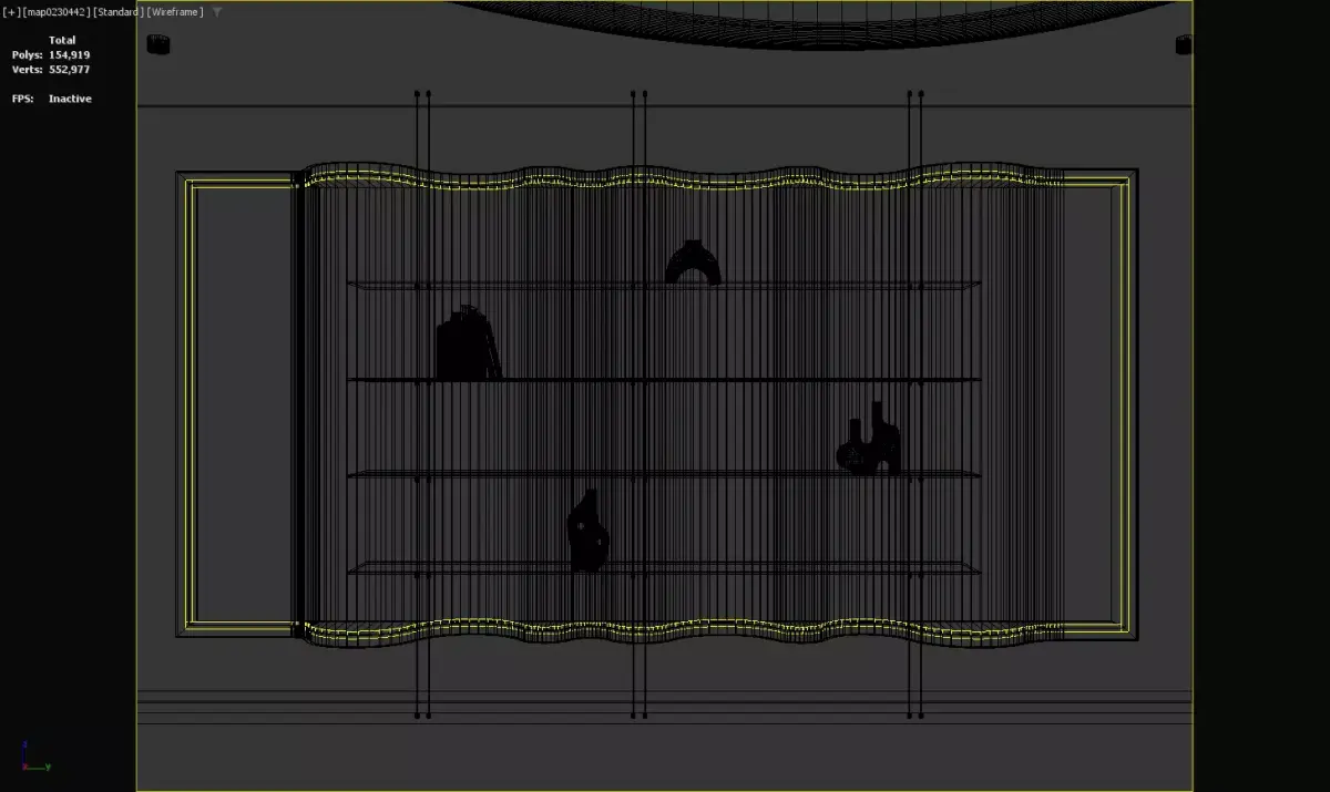 Luxury wall-mounted display shelf featuring a gold, wavy metal design with glass shelves, showcasing artistic vases and books. Set against a marbled wall with ambient lighting, ideal for upscale interiors like lobbies, living rooms, or art spaces, blending functional display with high-end aesthetic appeal.
