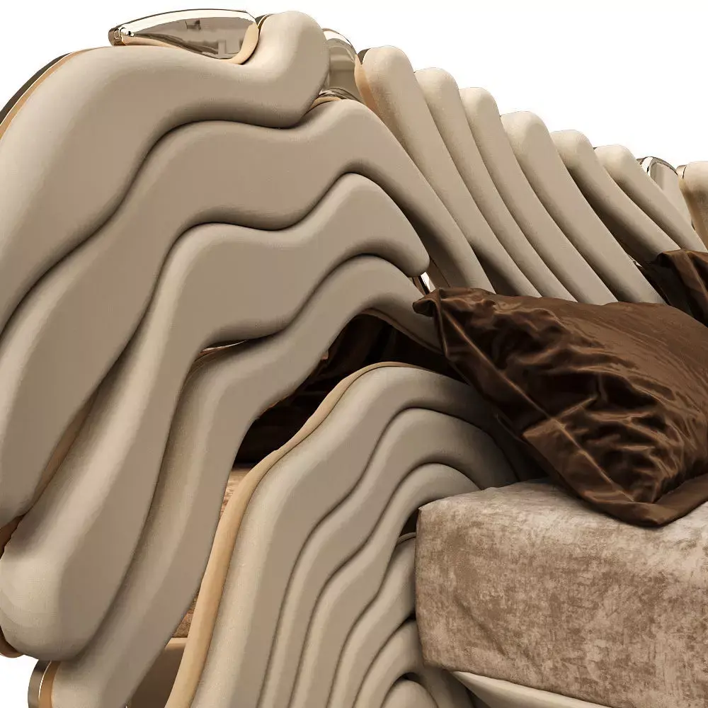 Premium king-size bed with a distinctive multi-layer wavy headboard. Soft upholstered pads float over glossy metal insets for a high-end boutique look.