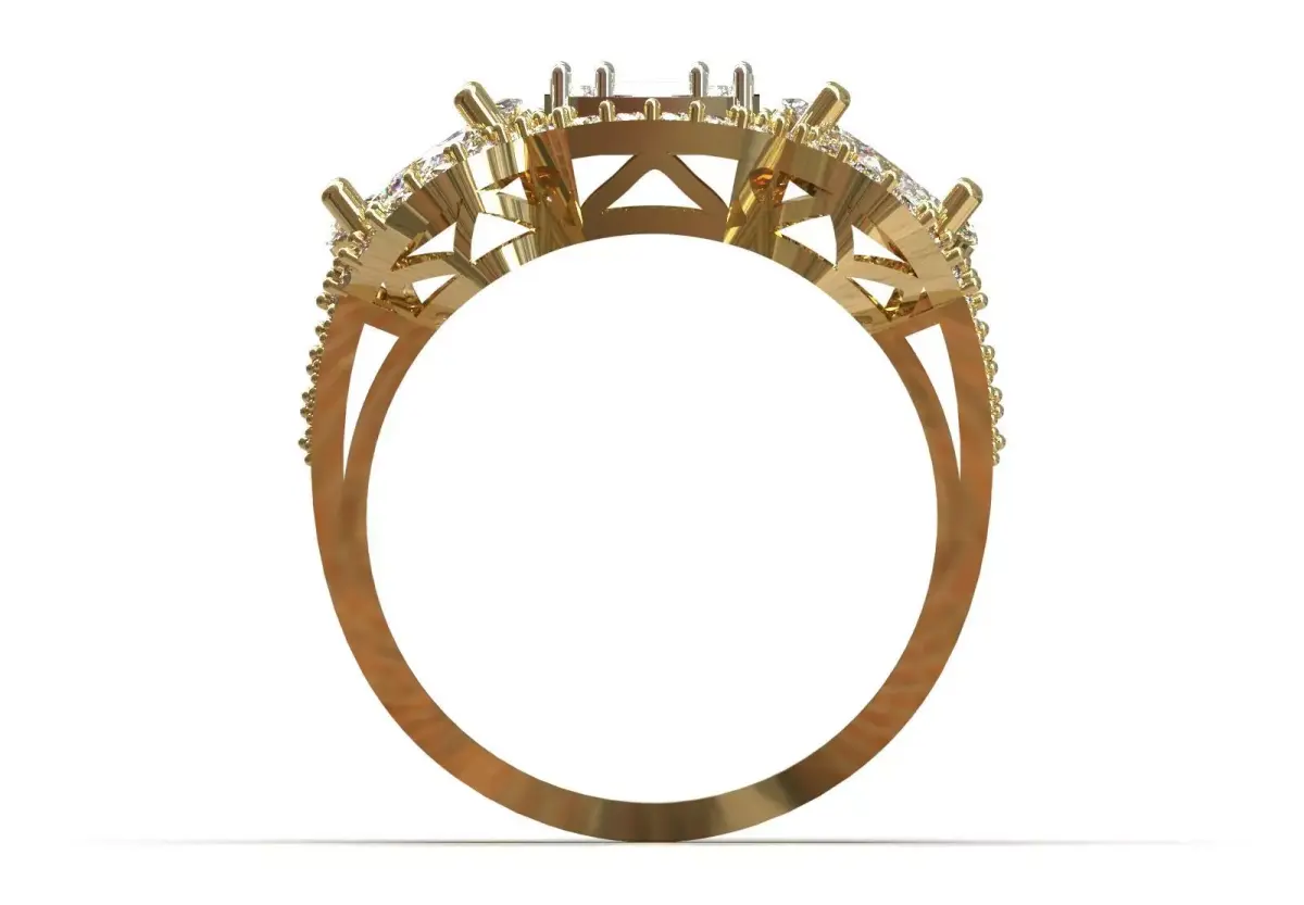 - Worked body: The body of the ring (Shank) is made of shiny yellow gold and has lattice designs and delicate engravings under the main parts as well as on the shoulders of the ring.