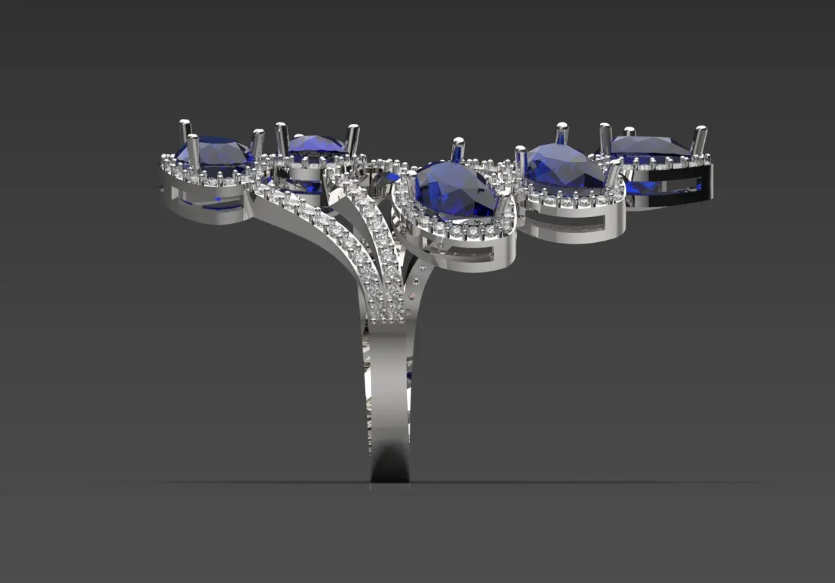 This exquisite ring features a striking design that showcases five deep blue teardrop-cut sapphires, each beautifully surrounded by a halo of sparkling diamonds. The sapphires are set in a unique arrangement, where they rise majestically from the arm, creating a sense of movement and flow.