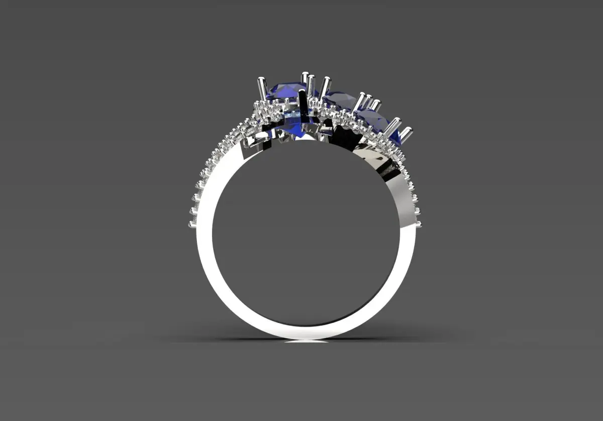 This ring is crafted from white gold, which enhances the brilliance of the sapphires and diamonds. The delicate, interlocking arms add a modern feel, while the intricate detailing, diamonds along the arms, add further sparkle and sophistication.