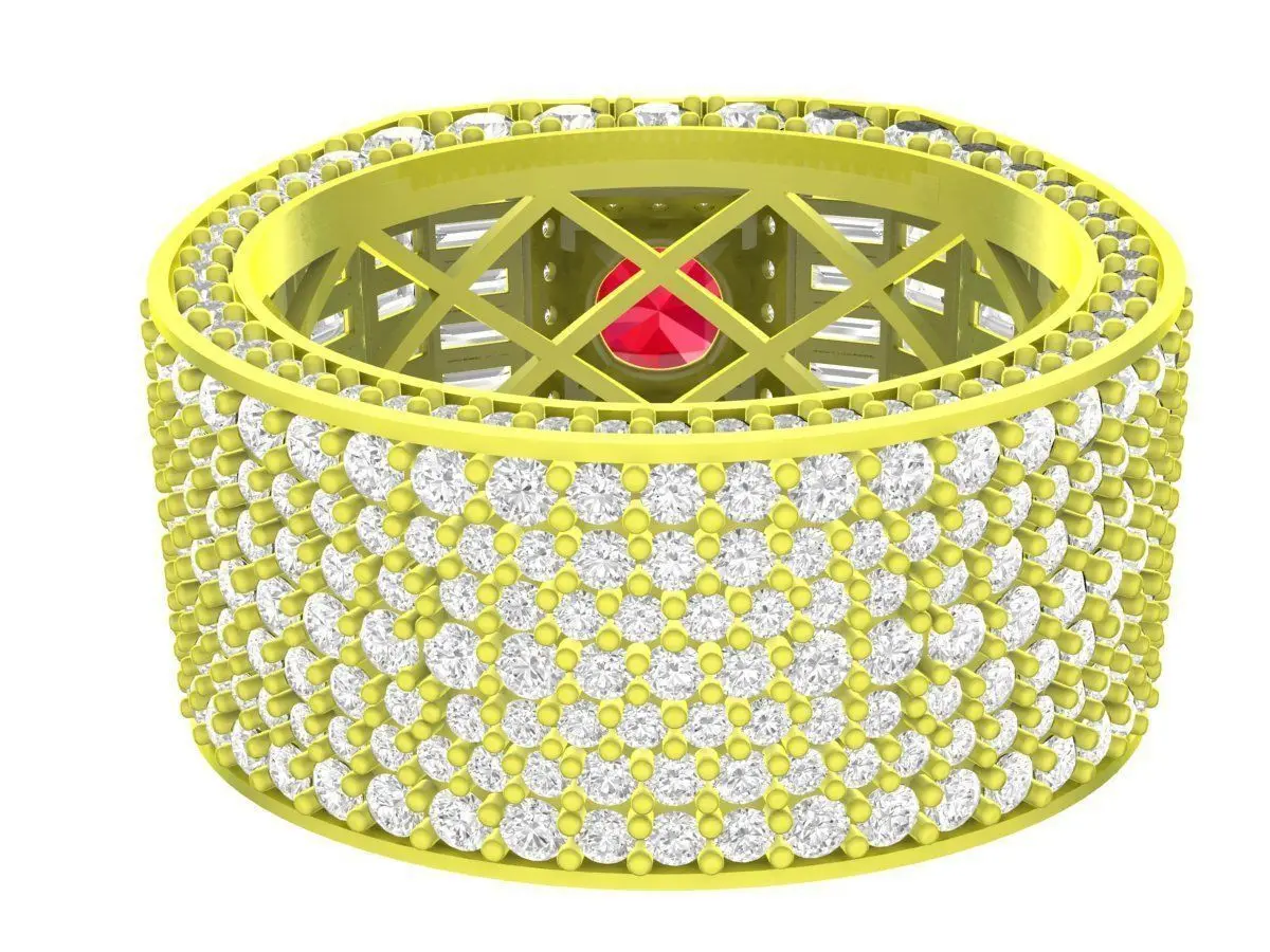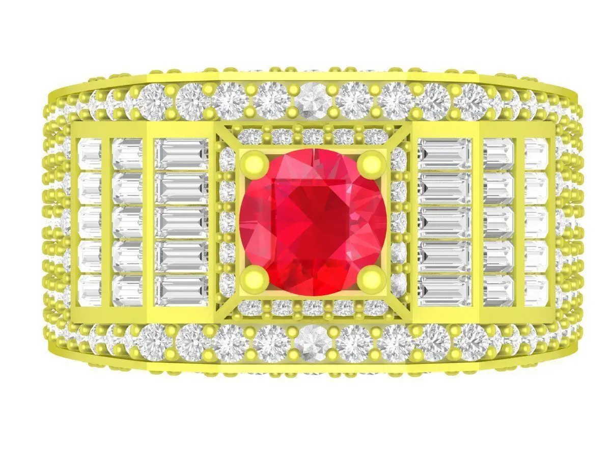 This luxury wide band ruby men ring is a professional 3D jewelry model designed for bold and high-end men’s jewelry collections. The ring features a large central ruby-style gemstone secured in a strong prong setting, surrounded by precisely arranged pavé and baguette-cut stones for maximum brilliance.
