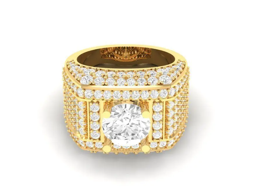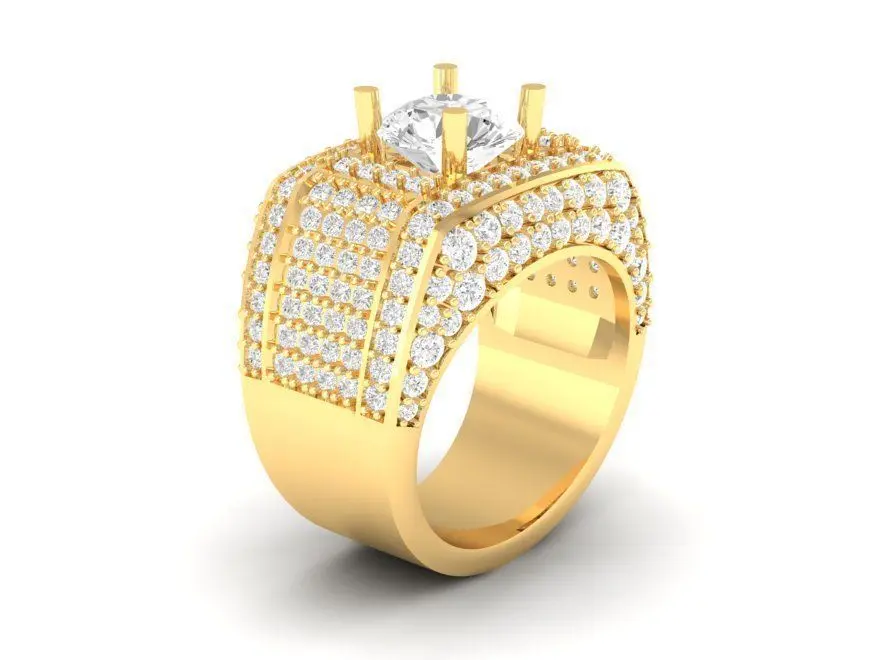 This 3D CAD model showcases a luxury wide band diamond men’s ring designed with a bold and sophisticated look. The centerpiece features a large round gemstone, surrounded by multiple rows of pave-set diamonds that cover the entire surface of the ring. This design emphasizes both masculinity and elegance, making it suitable for high-end fashion jewelry.