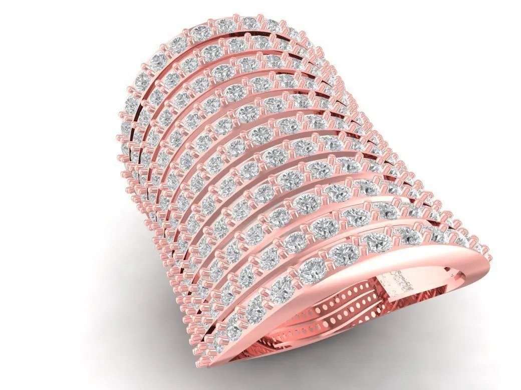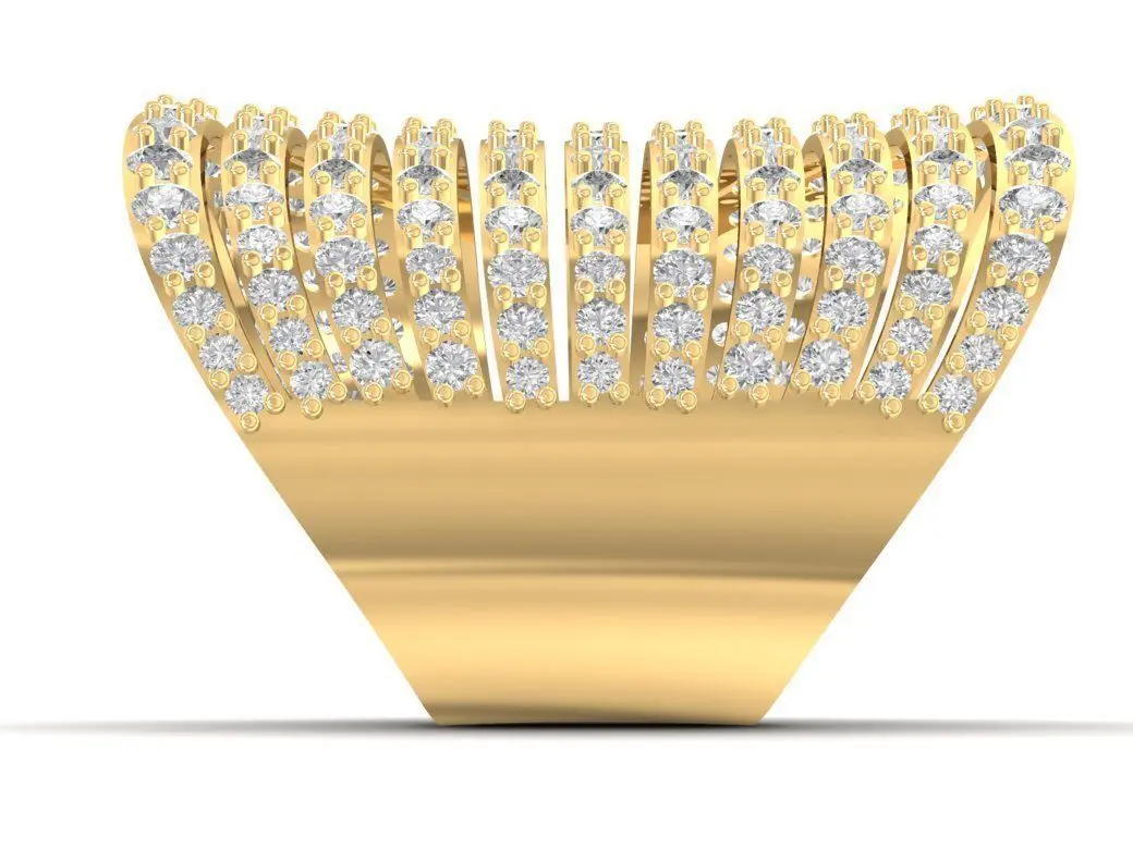 This luxury wide band ring features multiple rows of sparkling round diamonds set across a curved surface, creating a dazzling and sophisticated appearance. The smooth interior and elegant dome structure provide both comfort and style. Designed for confident women who appreciate bold statement jewelry, this piece combines modern design with timeless luxury.