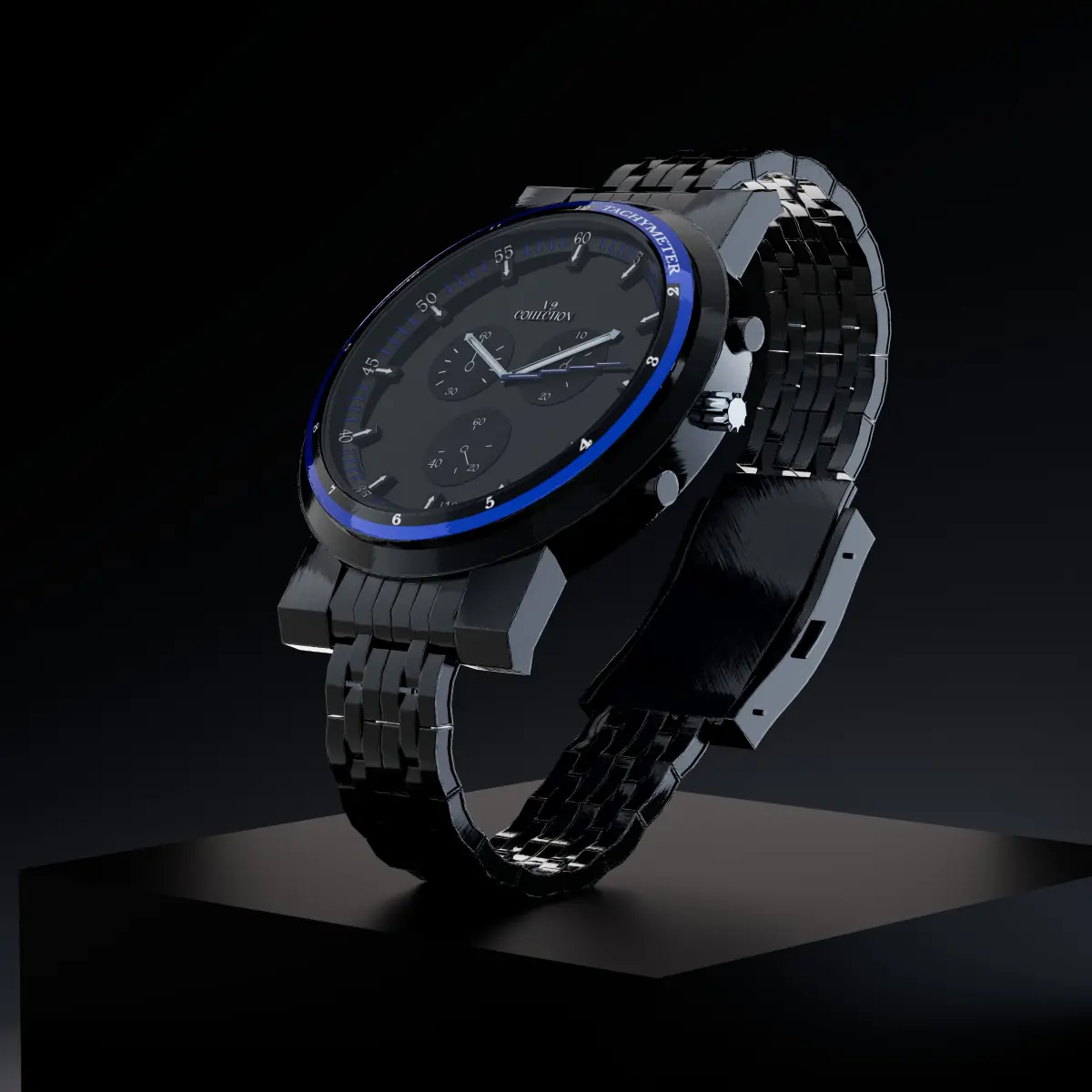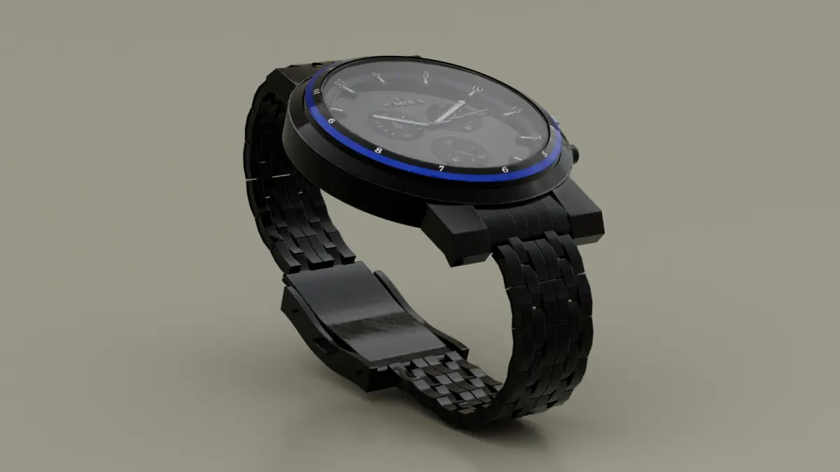 This is a meticulously designed 3D model of a luxury wristwatch, created in Maya and optimized for use in various applications such as product visualization, game development, VR/AR experiences, and animation. The model features a sleek and modern design with a polished metallic finish, intricate detailing on the strap, and a high-resolution watch face.