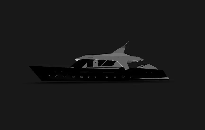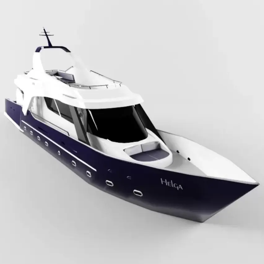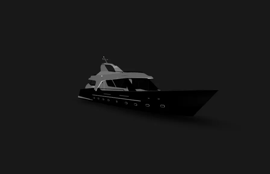 This detailed 3D model showcases a modern luxury yacht designed for use in high-end visualizations, animations, or interactive environments. The model features a clean, elegant design with a realistic navy blue and white color scheme. Key elements include: