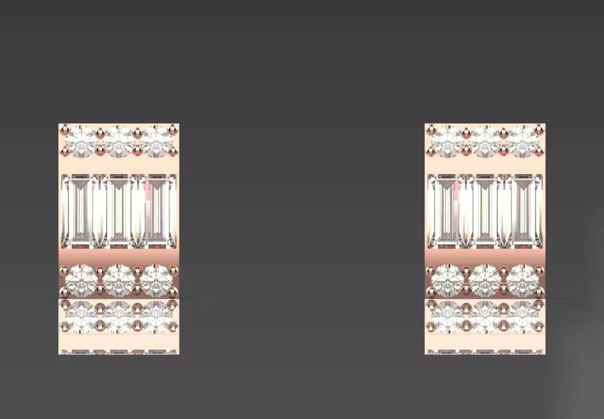 Around and on the sides of these baguette diamonds, rows of round brilliant diamonds are placed in a precise and regular manner. The combination of the brilliance of brilliant diamonds with the smooth lines of baguette diamonds gives these earrings a unique beauty and makes them an ideal choice for modern and stylish styles.