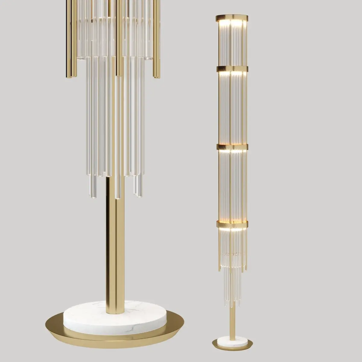 The Pharo Floor Lamp is designed in a simple and robust style and made of brass and crystal, this piece takes both the architecture and the symbolism of lighthouses into account and is able to light up any space as a beacon.