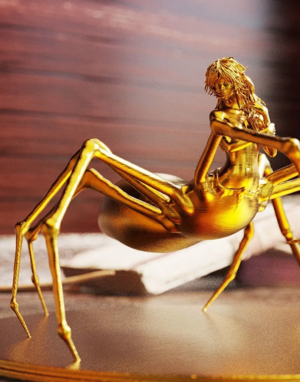 Français:Une œuvre qui tisse une toile d'élégance et de mystère. Fusion parfaite entre la femme et l'arachnide, elle représente la force féminine dans toute sa complexité, évoquant à la fois la délicatesse et la dangerosité. Ses multiples bras, fins et agiles, semblent prêts à créer des chefs-d'œuvre de soie, tandis que son allure captivante ensorcèle ceux qui osent croiser son regard.