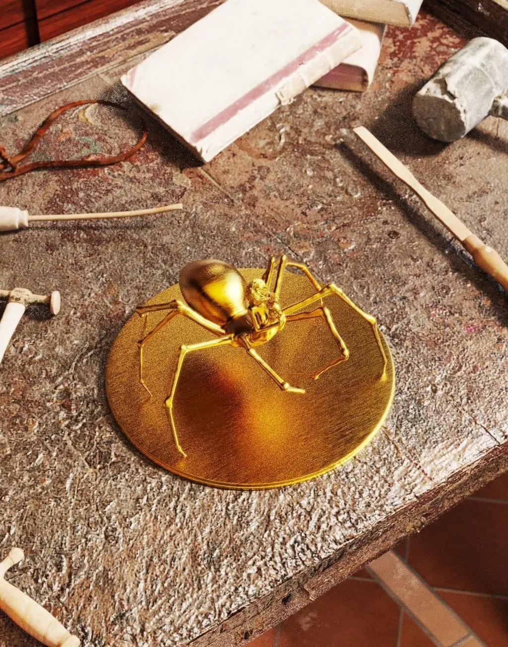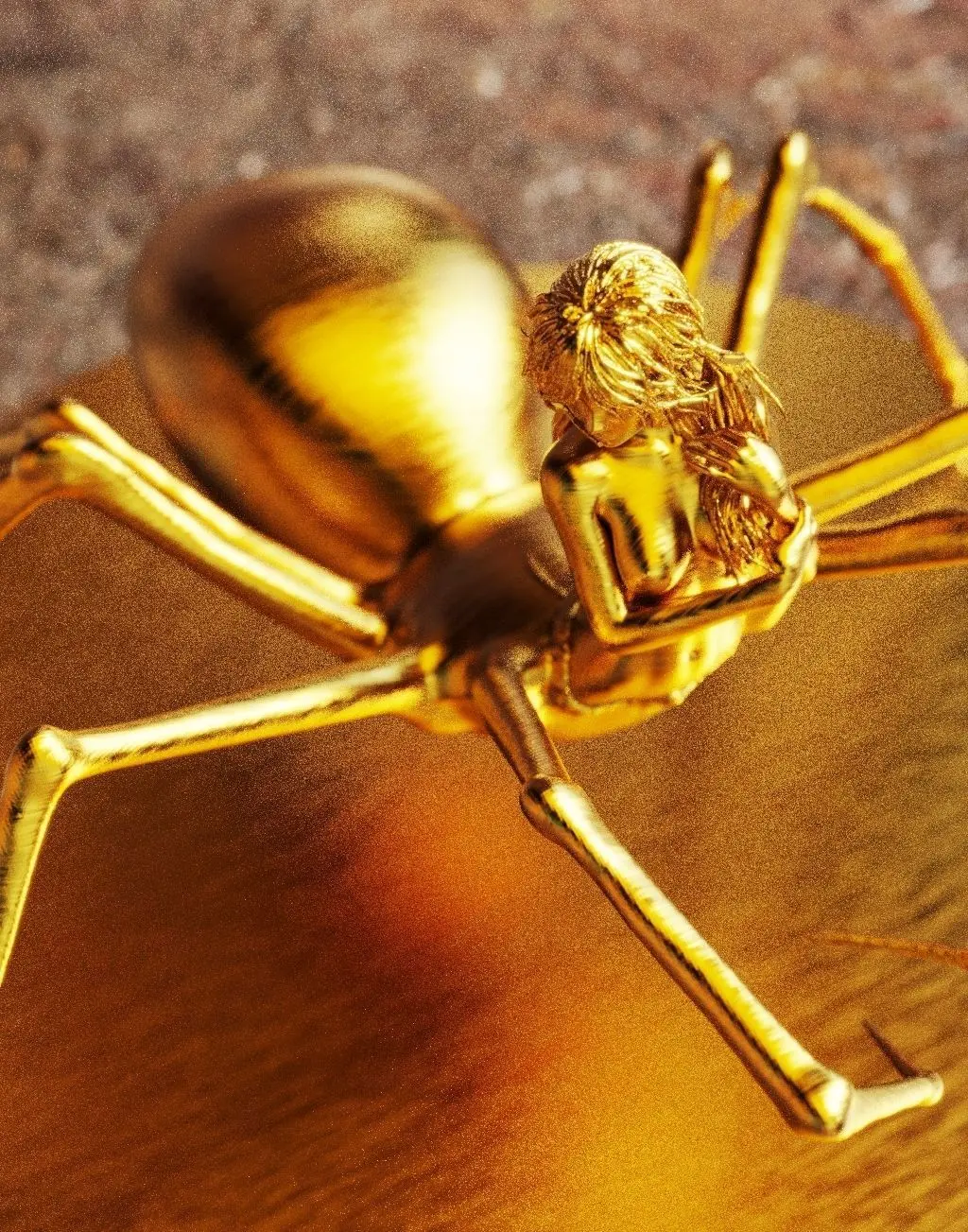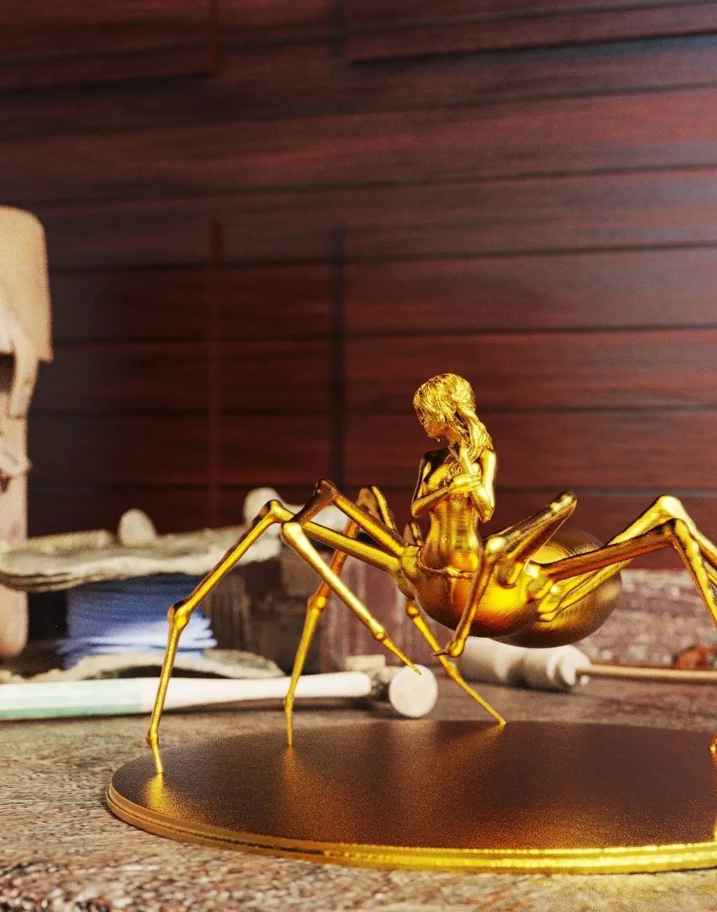 English:Is an art piece that weaves a web of elegance and mystery. A perfect fusion between woman and arachnid, it portrays feminine strength in its most intricate form, embodying both delicacy and danger. Her numerous slender and agile limbs appear poised to craft silk masterpieces, while her captivating presence bewitches those daring enough to meet her gaze.