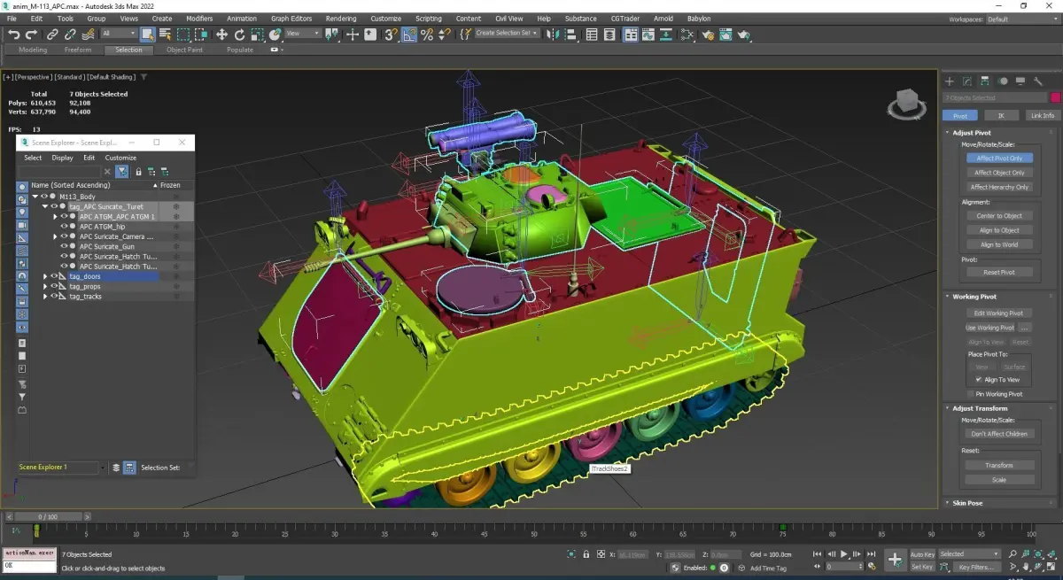 Doors, turret, domes, gun, wheels and other gears are seperated and be animatable.