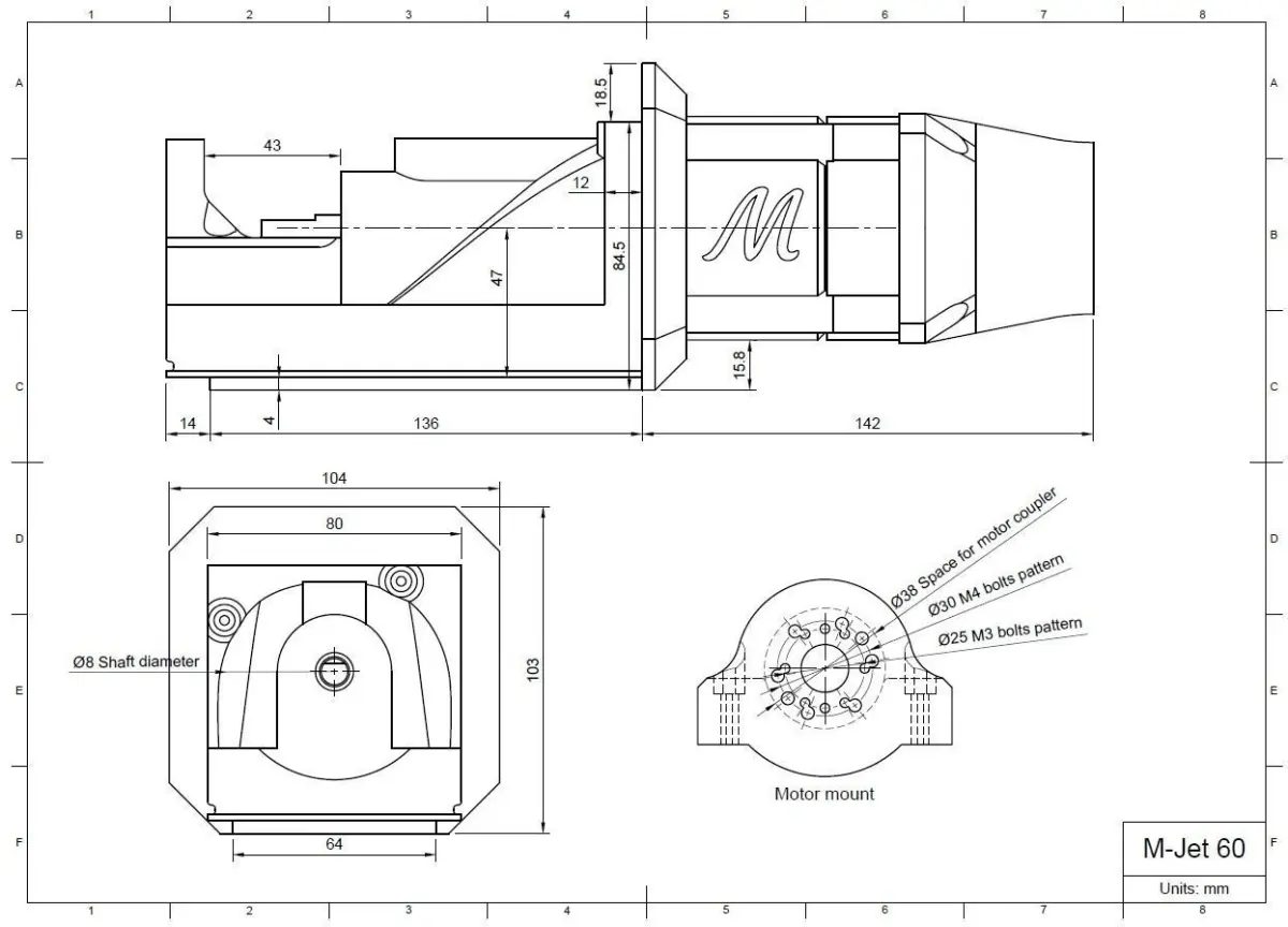 The design is heavily based on my previous M-Jet 30 pump. Main features are 2-stage configuration (2 impellers in a row), integrated motor mount, integrated watercooling, intake grate, thrust bearing, simple impeller mounting system, rear installation. The pump achieves 20kg thrust on 14000 RPM.