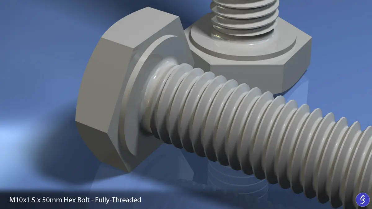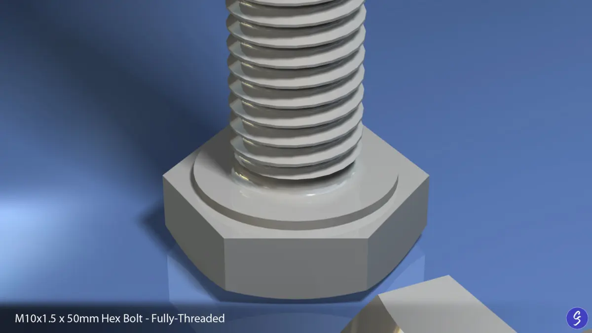 M10x1.5 x 50mm fully-threaded hex bolt, ready for use in CGI, CAD, and 3D print applications. Modeled in Autodesk Inventor and Carrara Studio and provided in multiple file formats.